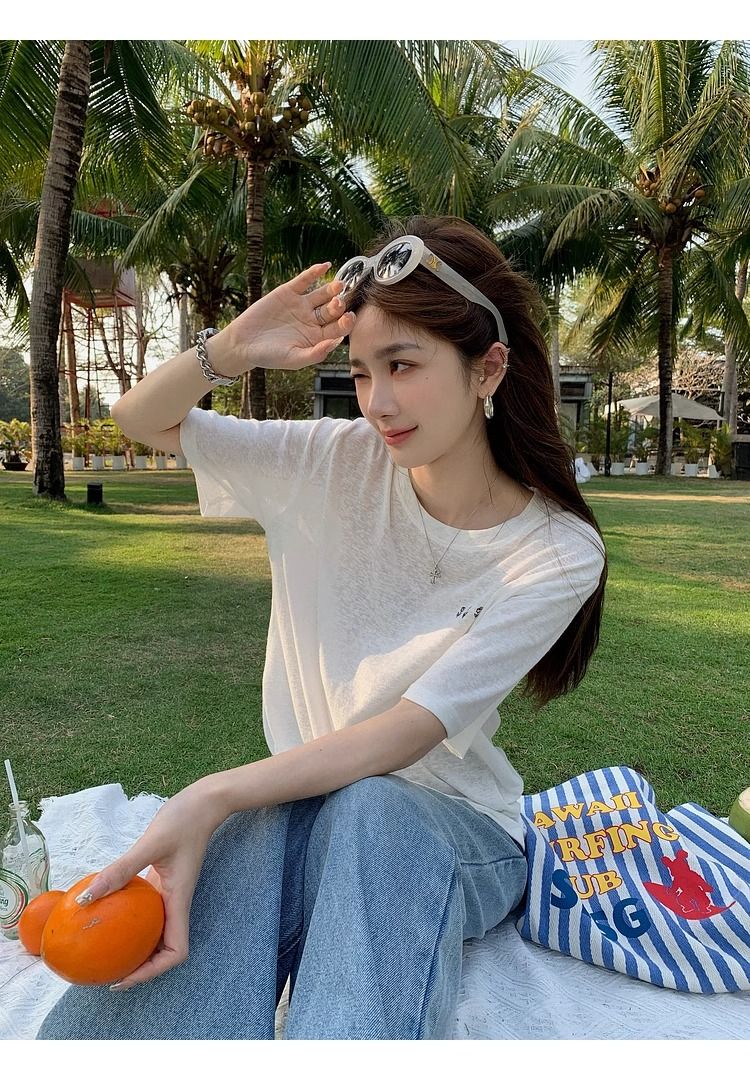 다용도 라운드 넥 긍정적 인 어깨 반팔 티셔츠 여성 여름 새로운 슬림해 보이는 인사이드 가져 가라. 달콤함 맨위