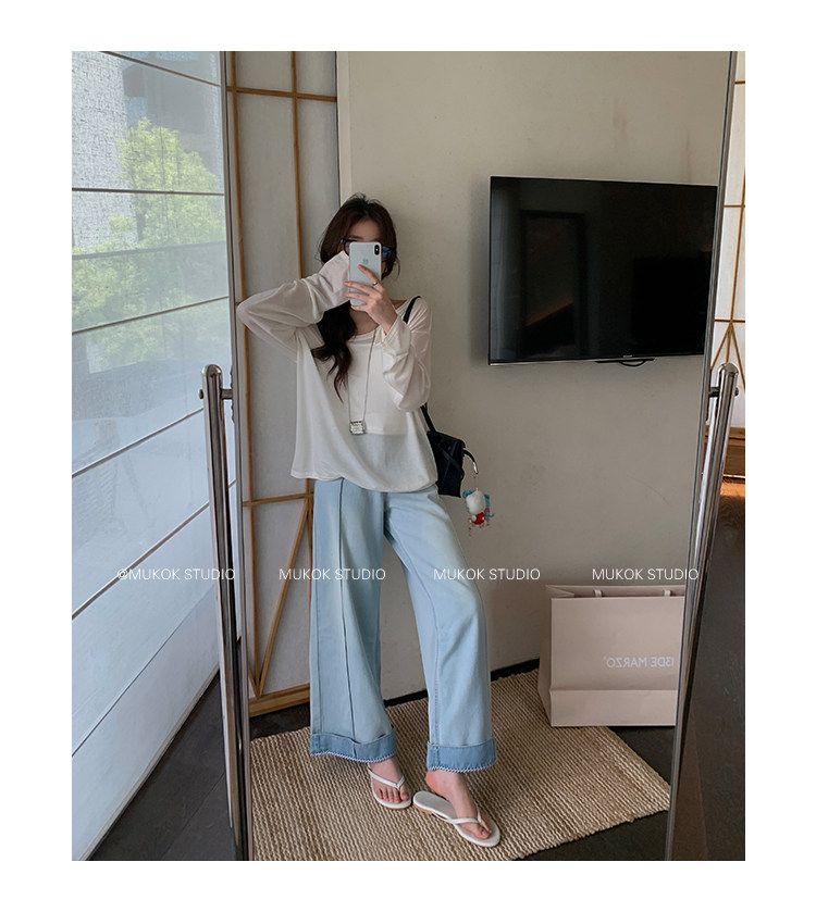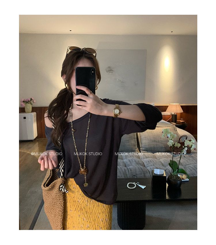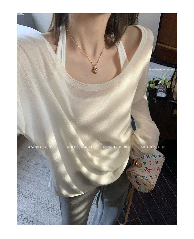 50 접착제 50 폴리에스터 t 루즈핏 비스듬한 어깨 배트윙 소매 니트 티셔츠 여성 부드러운 찹쌀 느긋한 센스 불규칙 맨위