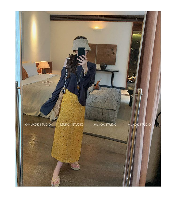 반하이넥 니트 반팔 단색 몸매 가꾸기 슬림해 보이는 맨위 체크무늬 한 마디 반신 미니 스커트 세트 여성
