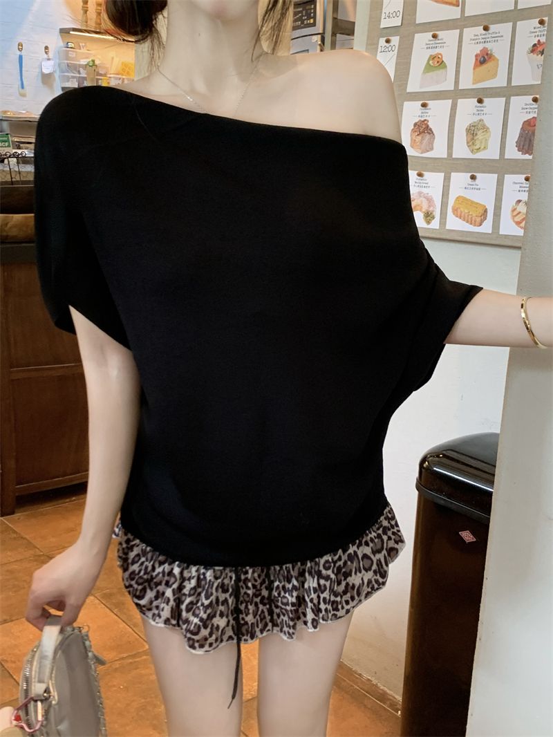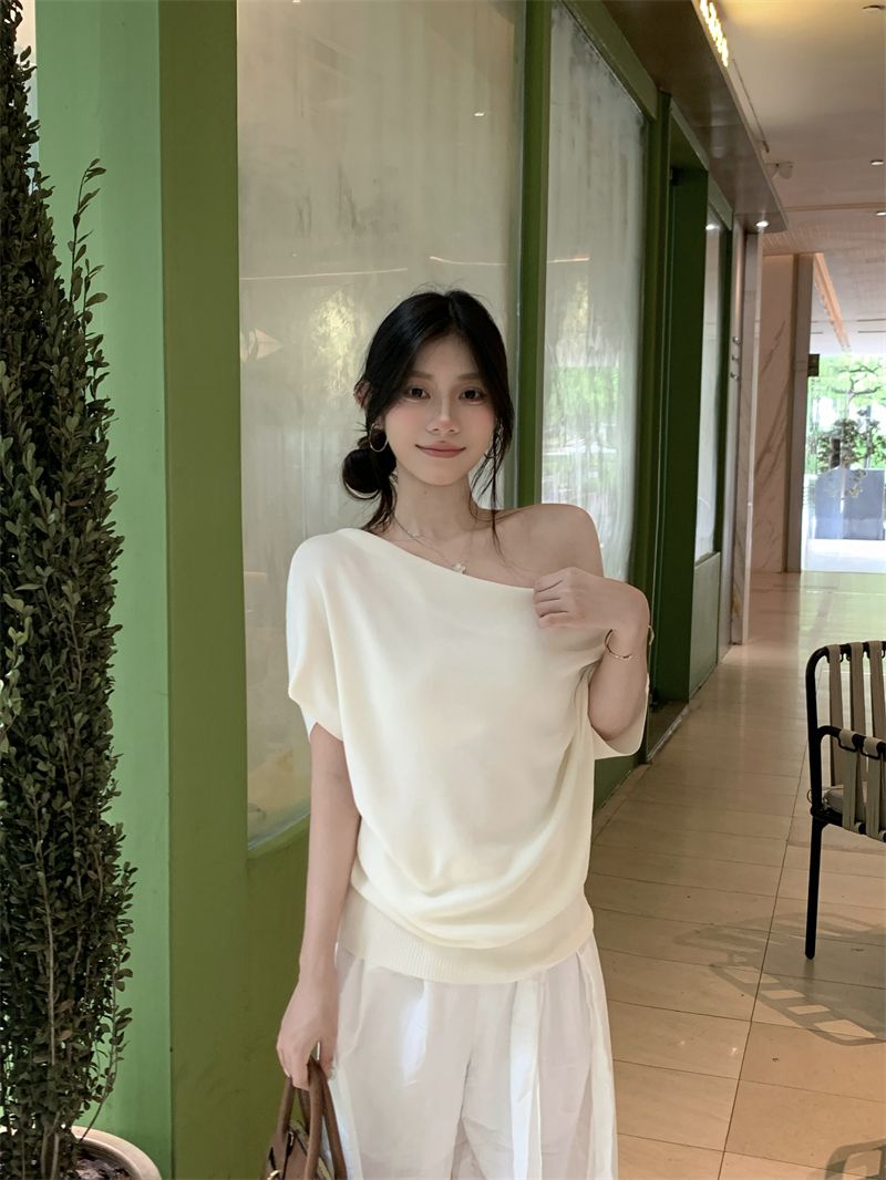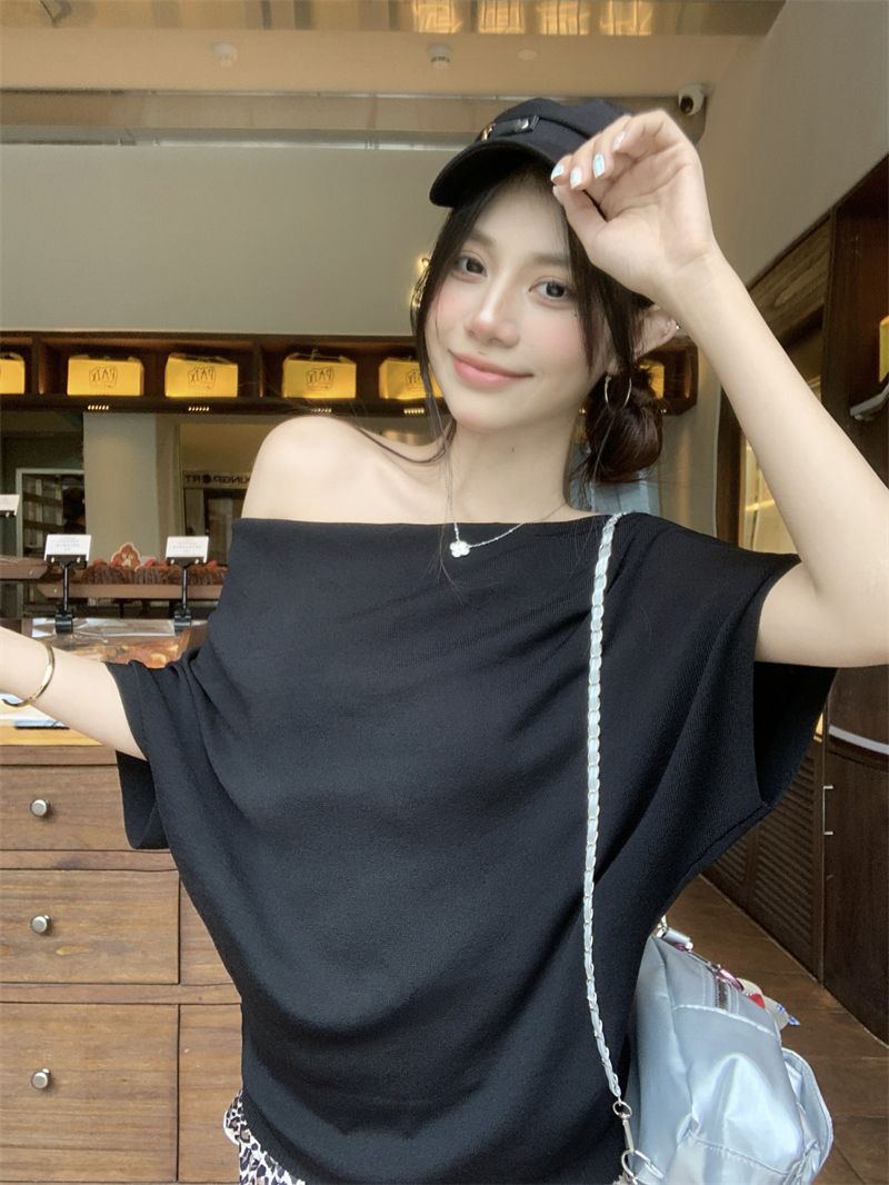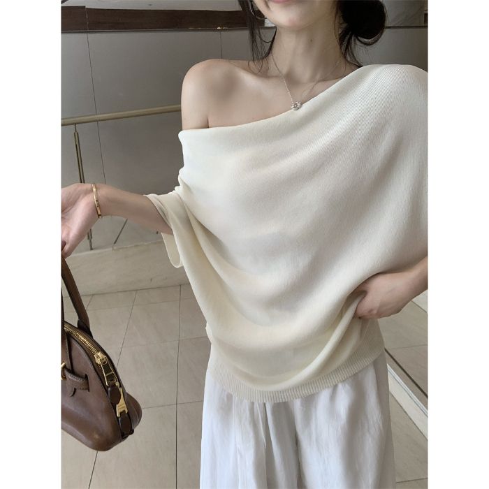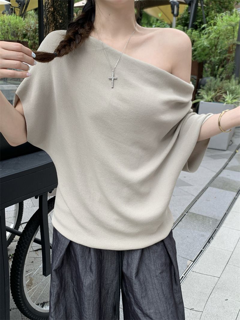 50 접착제 50 폴리에스터 t 루즈핏 비스듬한 어깨 배트윙 소매 니트 티셔츠 여성 부드러운 찹쌀 느긋한 센스 불규칙 맨위