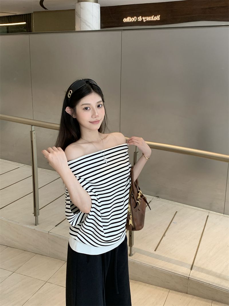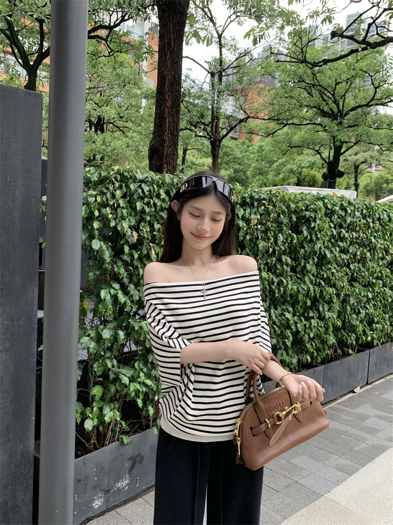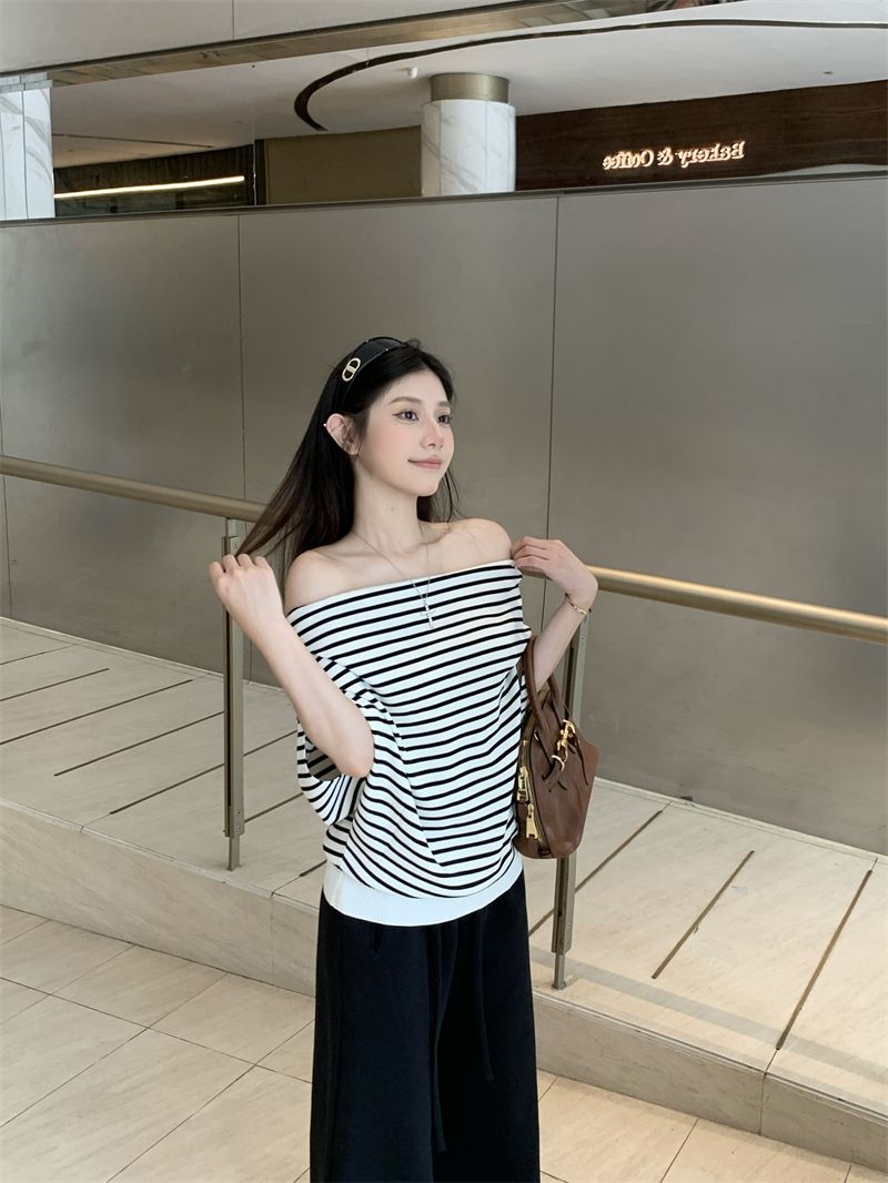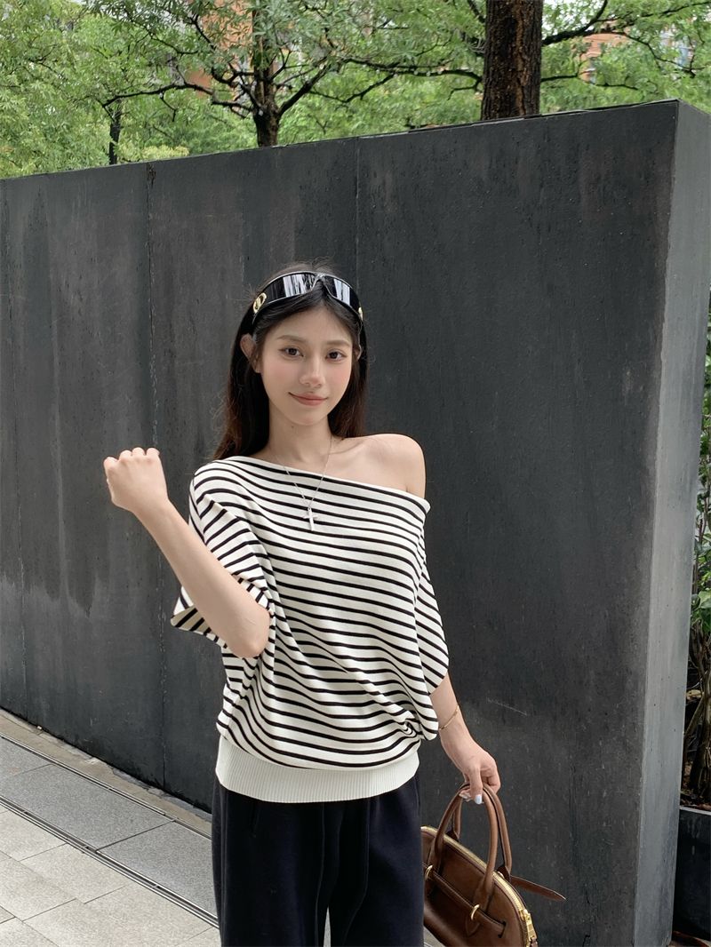 65 접착제 35 나일론 스트라이프 오프숄더 비스듬한 칼라 반팔 티셔츠 여성 작은 대중 디자인 센스 오프숄더 니트 스웨터