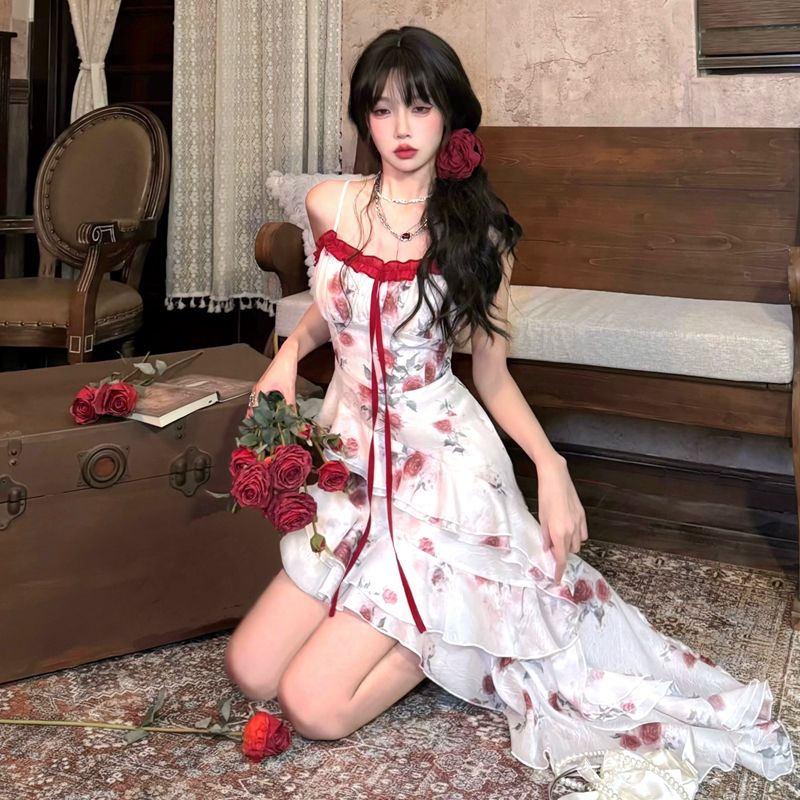 프랑스식 차 휴식 프릴 꽃무늬 불규칙 아름다운 해변가 휴가 바람 허리 수축 롱 스커트