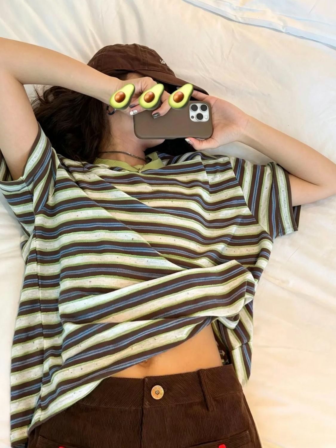 원본 원단 고유 한 배색 스트라이프 반팔 티셔츠 여성 한 부서 루즈핏 캐주얼 Chic 여성 의류