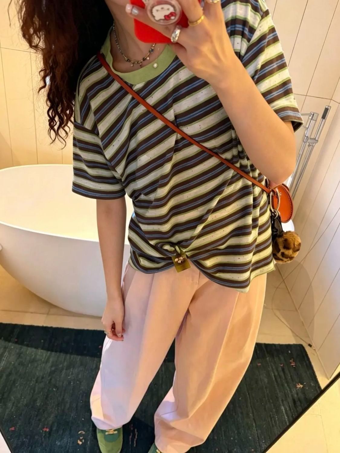 라이 경기 서울 핫걸 바람 루즈핏 중간 소매 티셔츠 여성 여름 스트라이프 행침 목 조끼 사실 두 조각 스택 착용 느긋한 바람 맨위