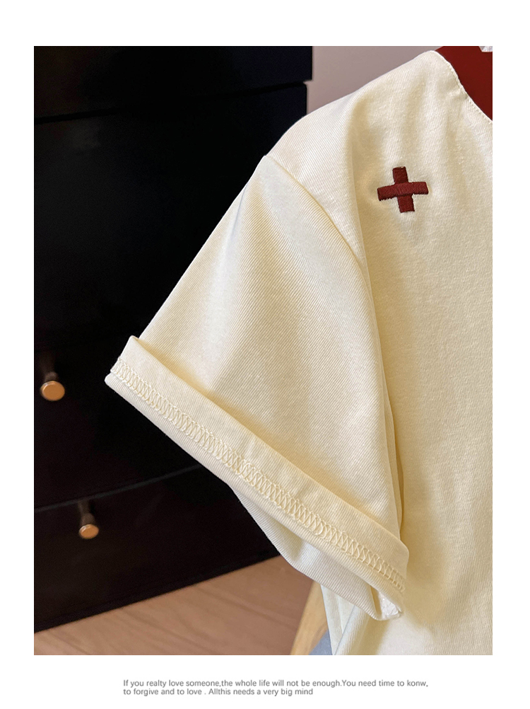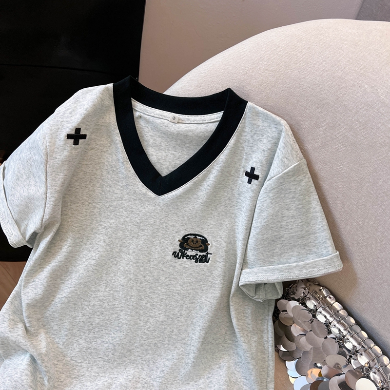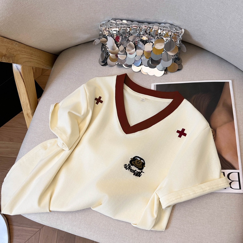 실사 핫걸 배색 패치워크 V넥 반팔 티셔츠 여성 여름 몸매 가꾸기 한국 스타일 인사이드 가져 가라. 기본 셔츠 반소매 맨위 트렌디