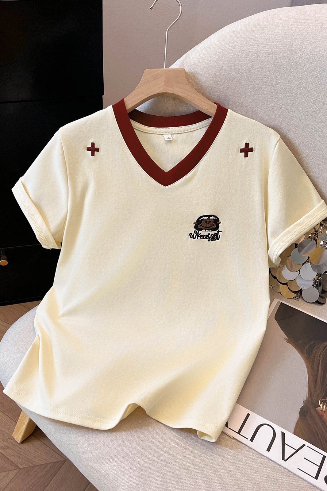 실사 1 1 리브 210 그램 반팔 티셔츠 여름 2026 새로운 트렌디 가시 자수 긍정적 인 어깨 V넥 맨위 한국 스타일 여성 의류