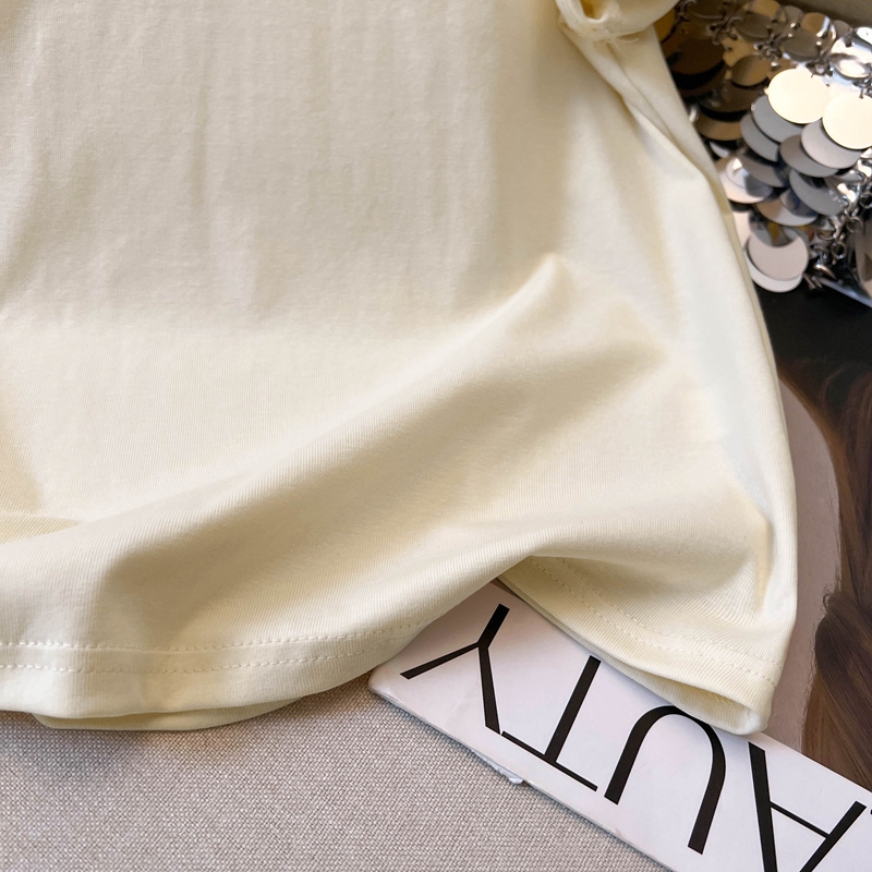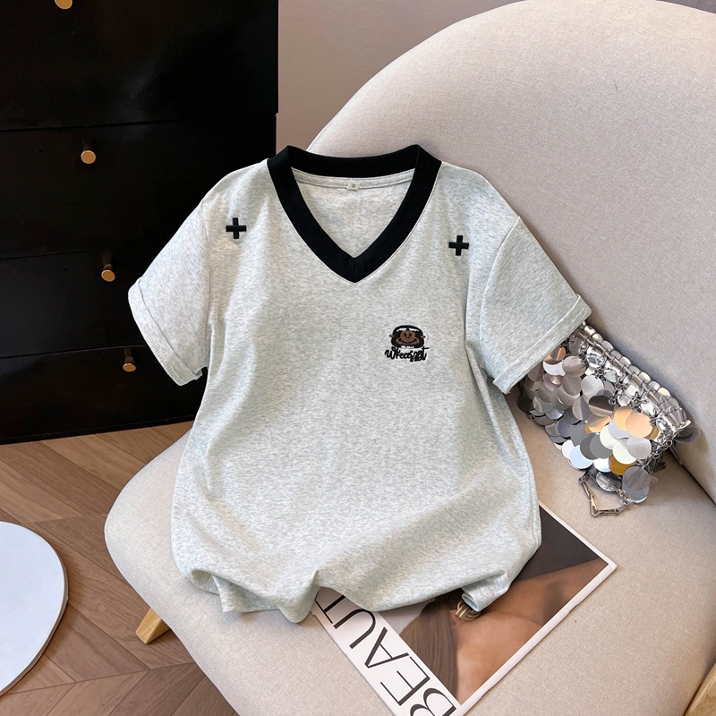 실사 느슨함 센스 대 u 칼라 대나무 마디 면 반팔 여성 티셔츠 여름 루즈핏 캐주얼 V넥 긍정적 인 어깨 반소매 티셔츠