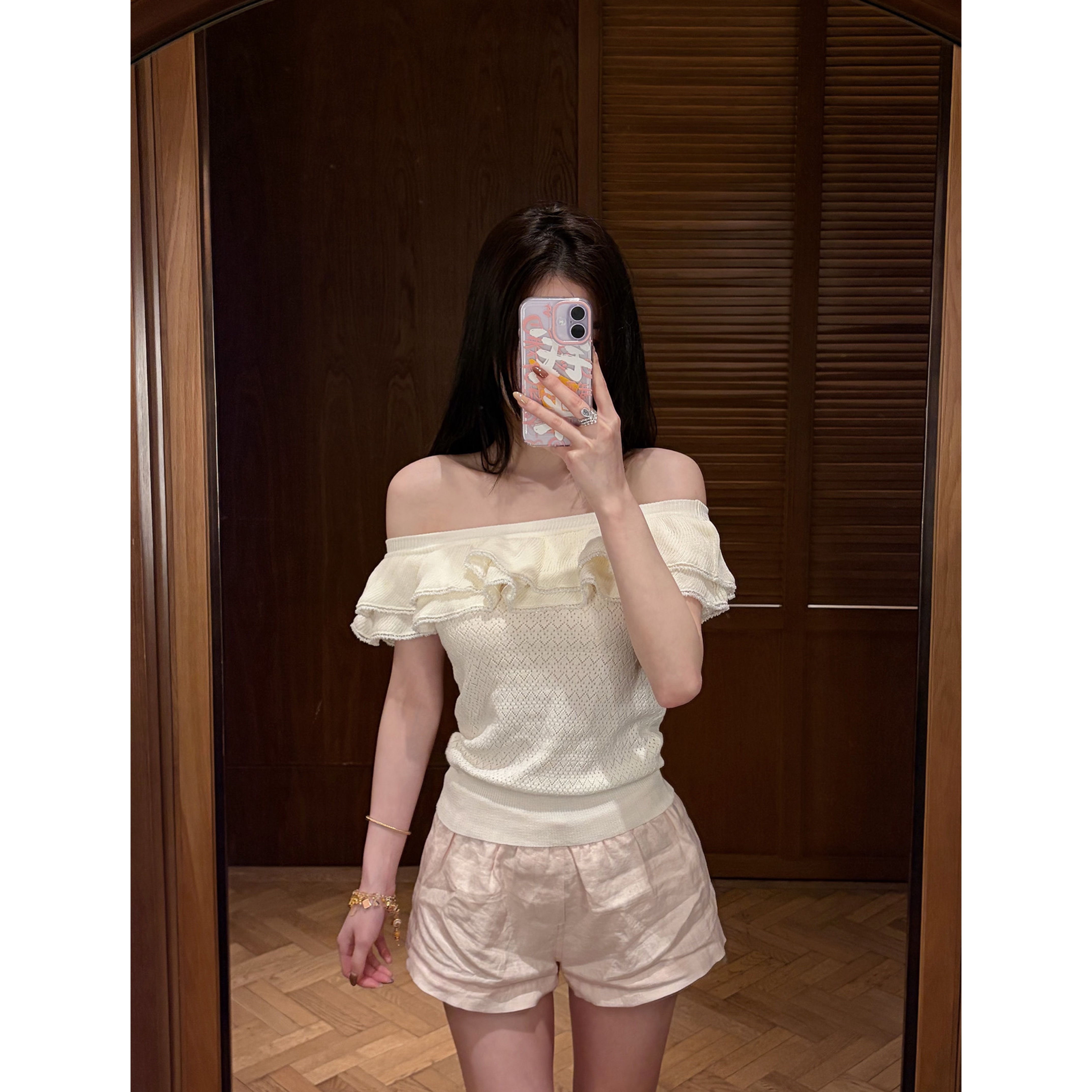 sheepland 아름다움 골 레이스 조각 오프숄더 니트 반팔 여성 봄 여름 얇은 스타일 슬림해 보이는 맨위