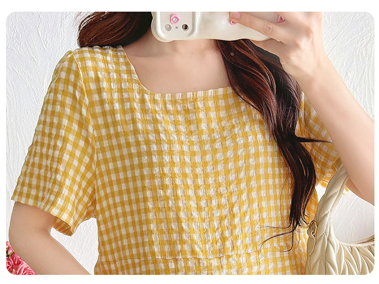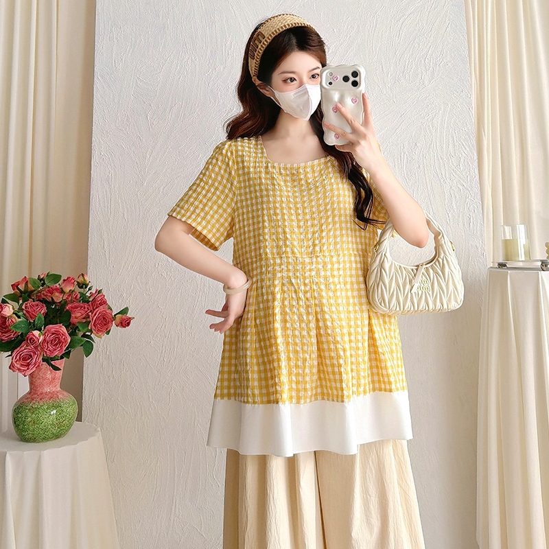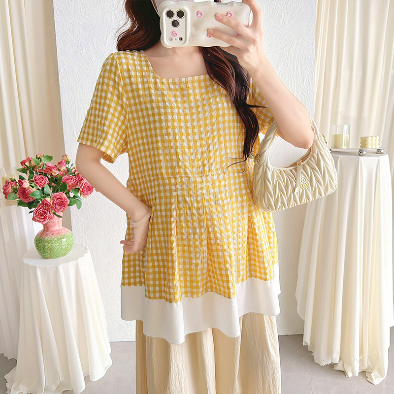 실사 여름 임산부 반팔 맨위 새로운 페이크 레이어드 체크무늬 맨위 여성 루즈핏 빅 사이즈 여성 의류
