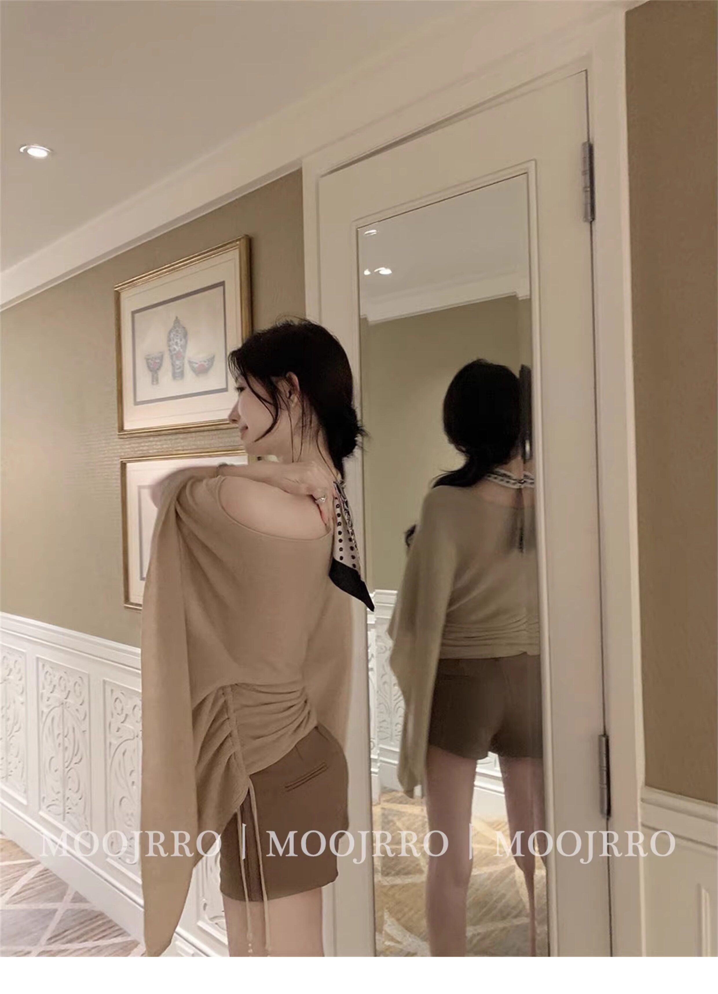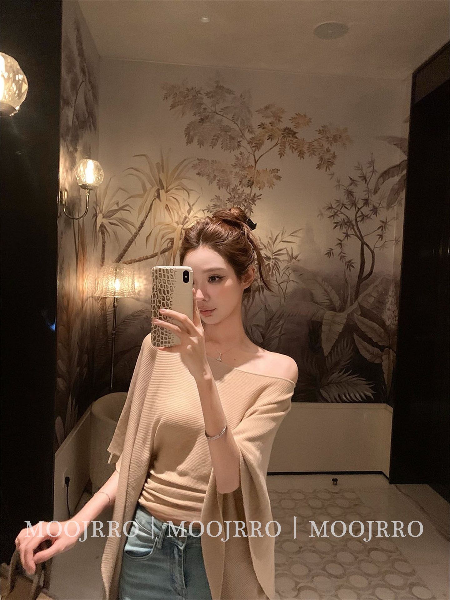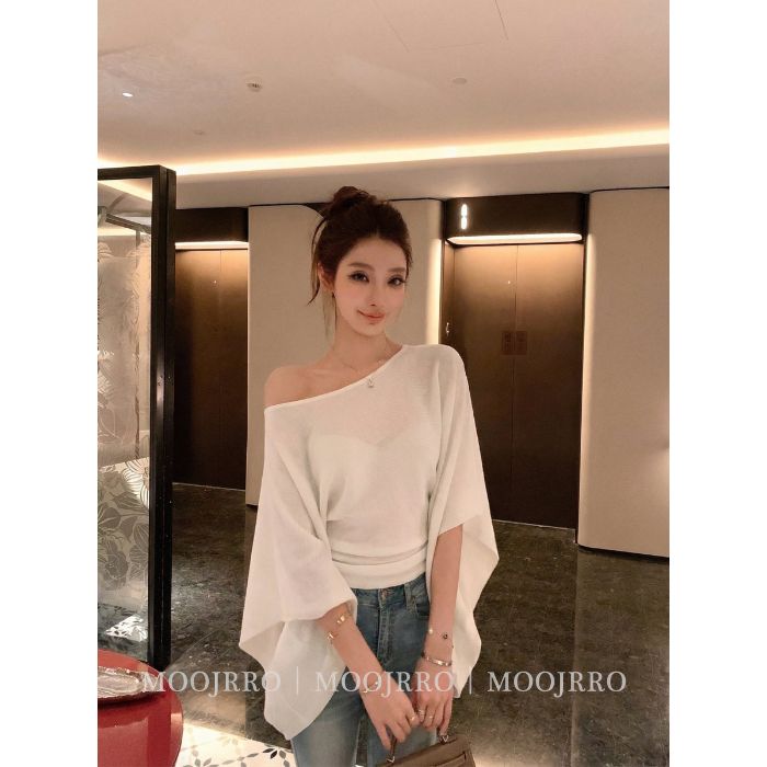 50 접착제 50 폴리에스터 t 루즈핏 비스듬한 어깨 배트윙 소매 니트 티셔츠 여성 부드러운 찹쌀 느긋한 센스 불규칙 맨위