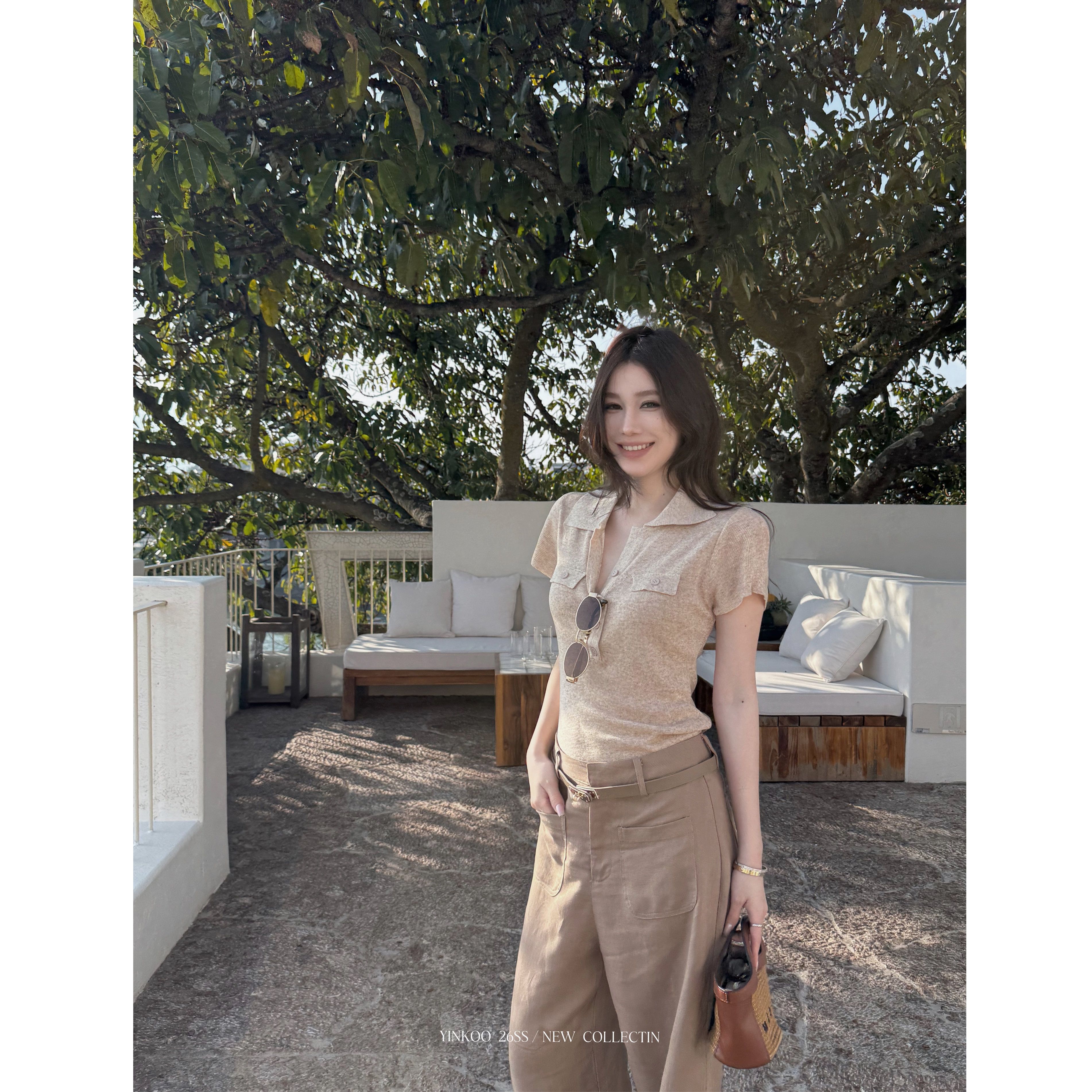 2026 새로운 폴로 칼라 단추 홀로우 아웃 품격 슬림해 보이는 고급 센스 외국 가스 반팔 티셔츠 니트 스웨터 맨위 여성