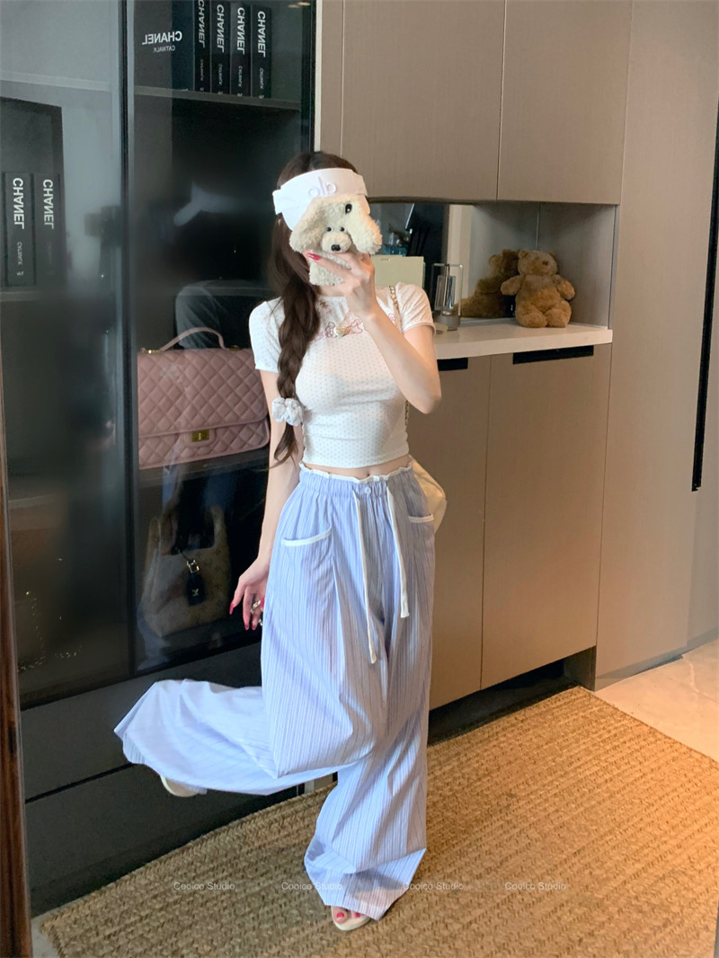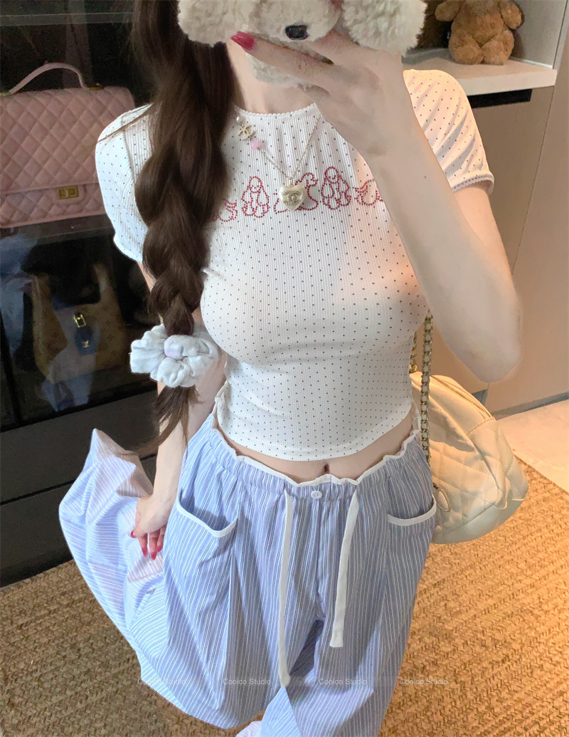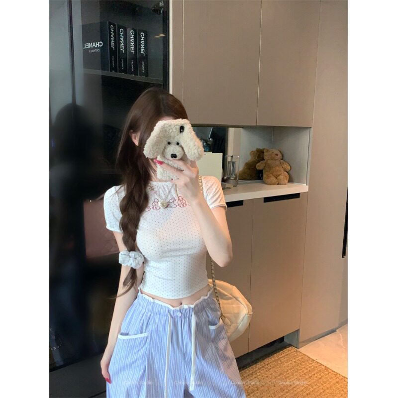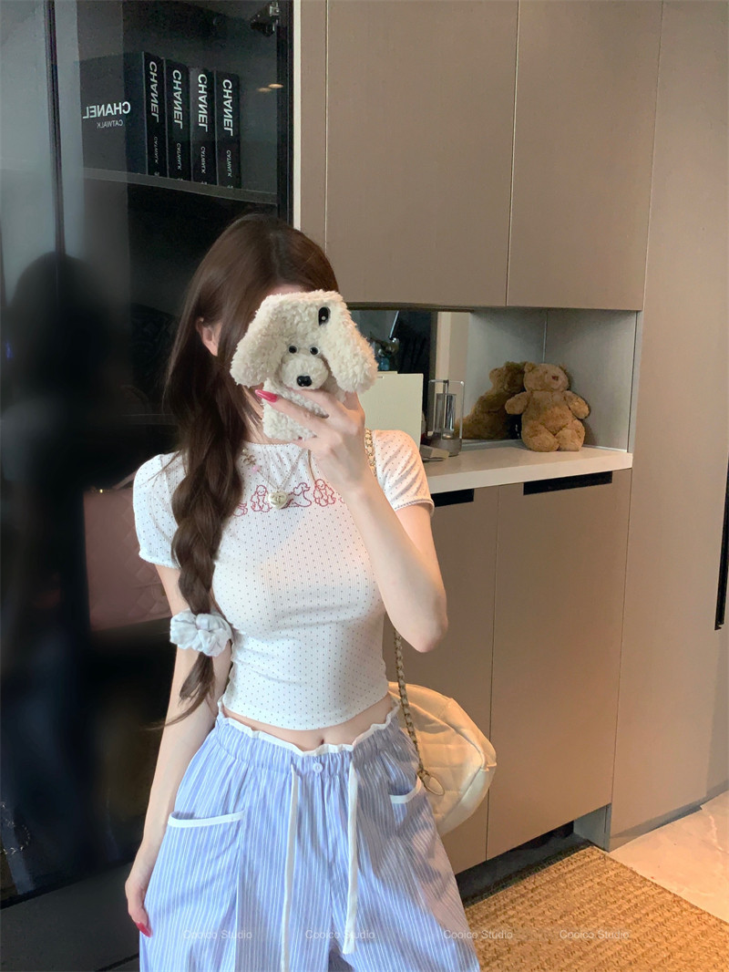 캐주얼 바람 강아지 핫픽스 도트 무늬 반팔 티셔츠 여성 봄 2026 새로운 몸매 가꾸기 쇼트 스타일 핫걸 라운드 넥 맨위