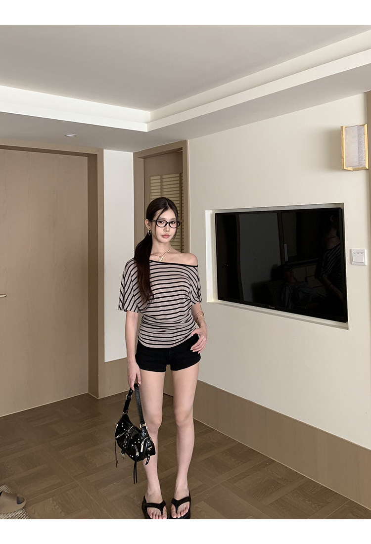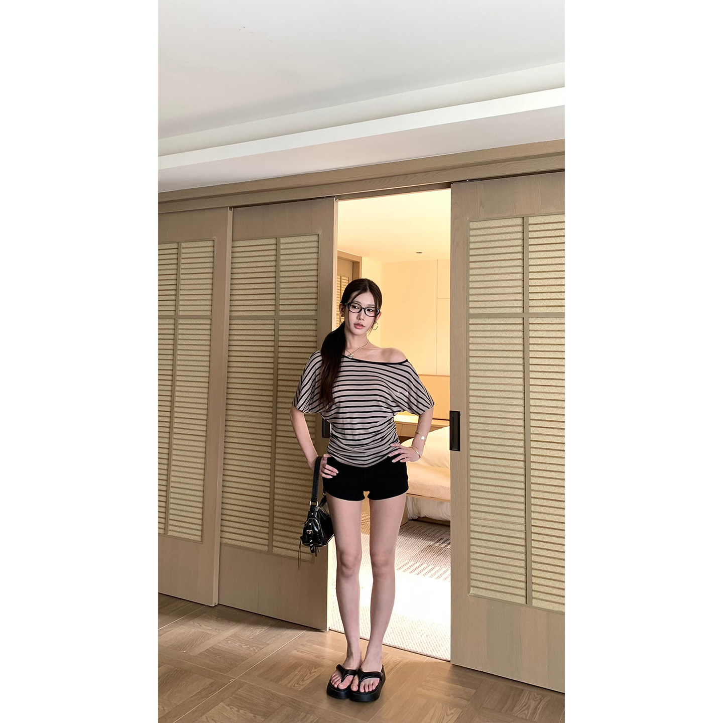 레드 맨 파빌리온 반팔 티셔츠 여성 2026 새로운 여름 착용 가져 가라. 튀김 거리 고유 한 아름다운 스트라이프 오프숄더 비스듬한 어깨 의류