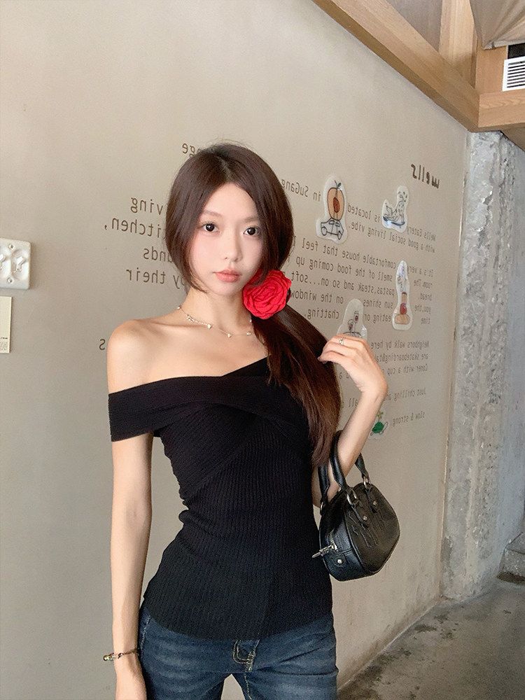 65 접착제 35 나일론 스트라이프 오프숄더 비스듬한 칼라 반팔 티셔츠 여성 작은 대중 디자인 센스 오프숄더 니트 스웨터