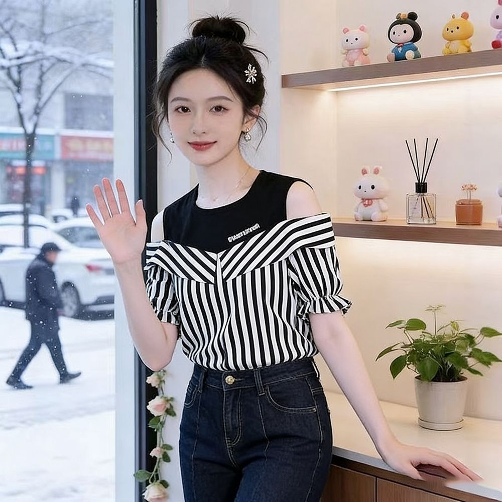 페이크 레이어드 여성 셔츠 2026 년 여름 한국 스타일 새로운 오프숄더 패치워크 스트라이프 루즈핏 라운드 넥 반팔 티셔츠 맨위