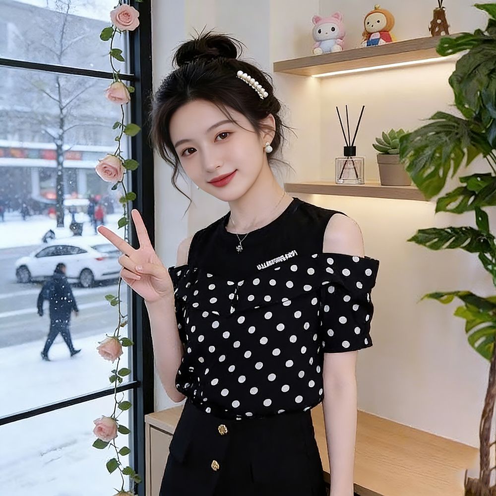 캐주얼 바람 강아지 핫픽스 도트 무늬 반팔 티셔츠 여성 봄 2026 새로운 몸매 가꾸기 쇼트 스타일 핫걸 라운드 넥 맨위