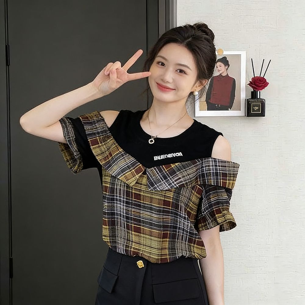 송 긍정적 인 En 녹색 페이크 레이어드 패치워크 긍정적 인 어깨 반팔 티셔츠 여성 여름 몸매 가꾸기 한 부서 아름다운 고유 한 작은 맨위