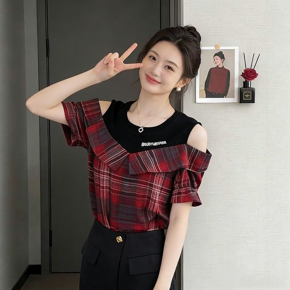 레드 맨 파빌리온 반팔 티셔츠 여성 2026 새로운 여름 착용 가져 가라. 튀김 거리 고유 한 아름다운 스트라이프 오프숄더 비스듬한 어깨 의류