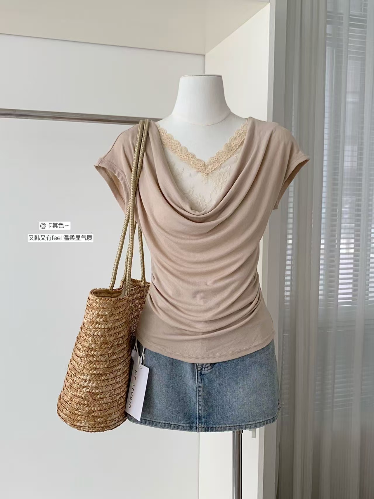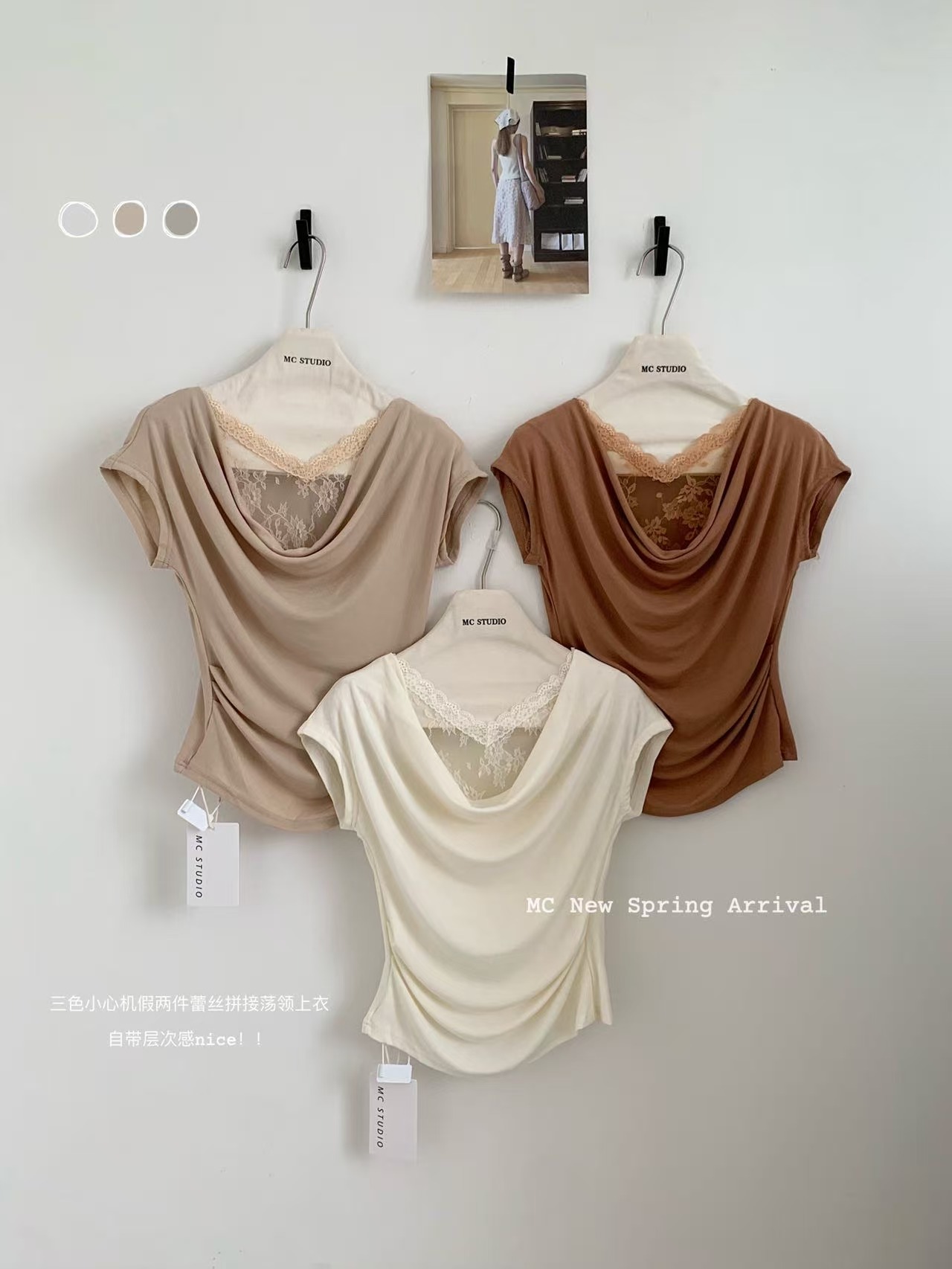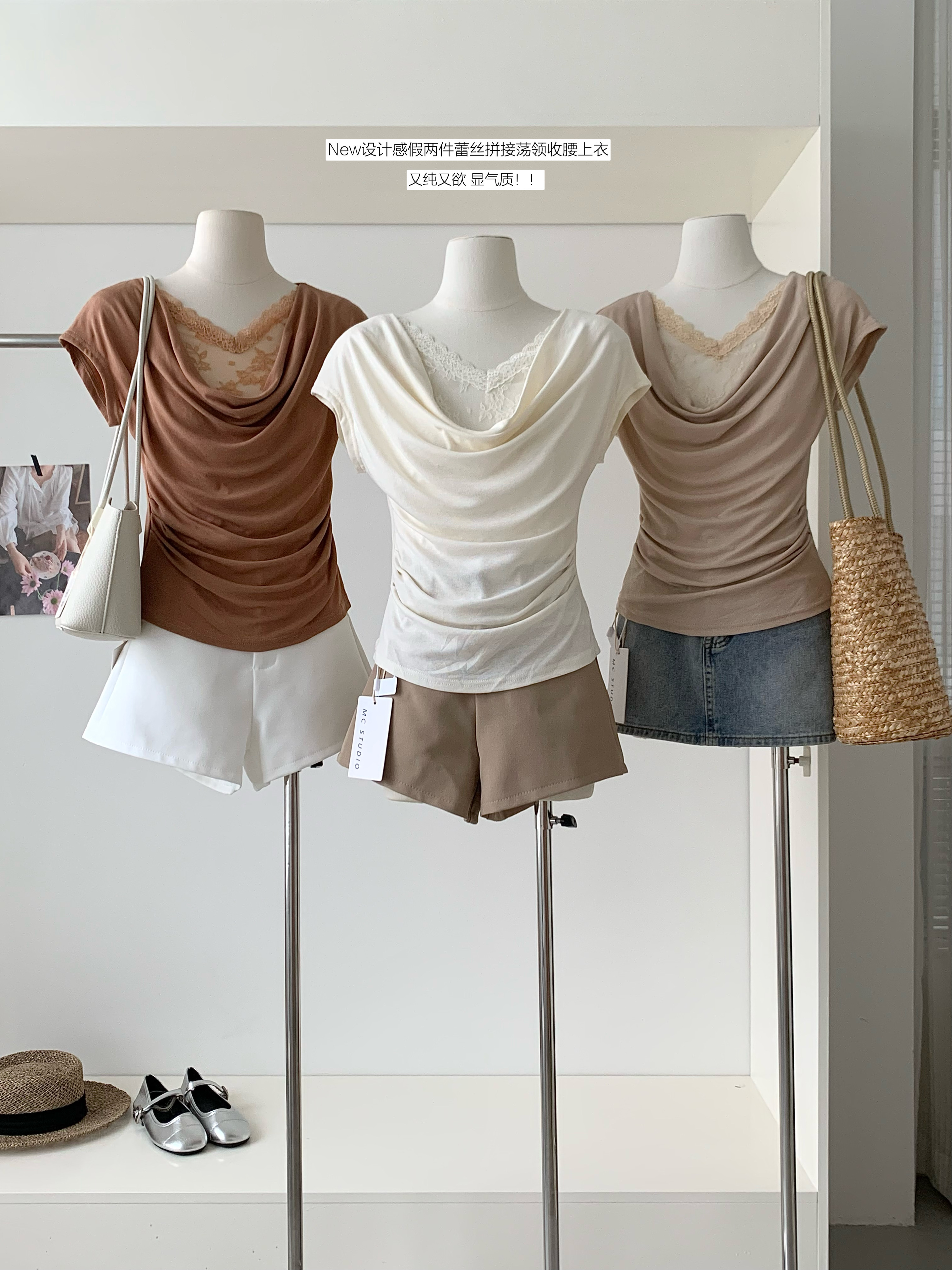 2026 여름 새로운 한국 스타일 품격 흔들다 칼라 패치워크 레이스 주름 허리 수축 슬림해 보이는 반팔 작은 셔츠 여성