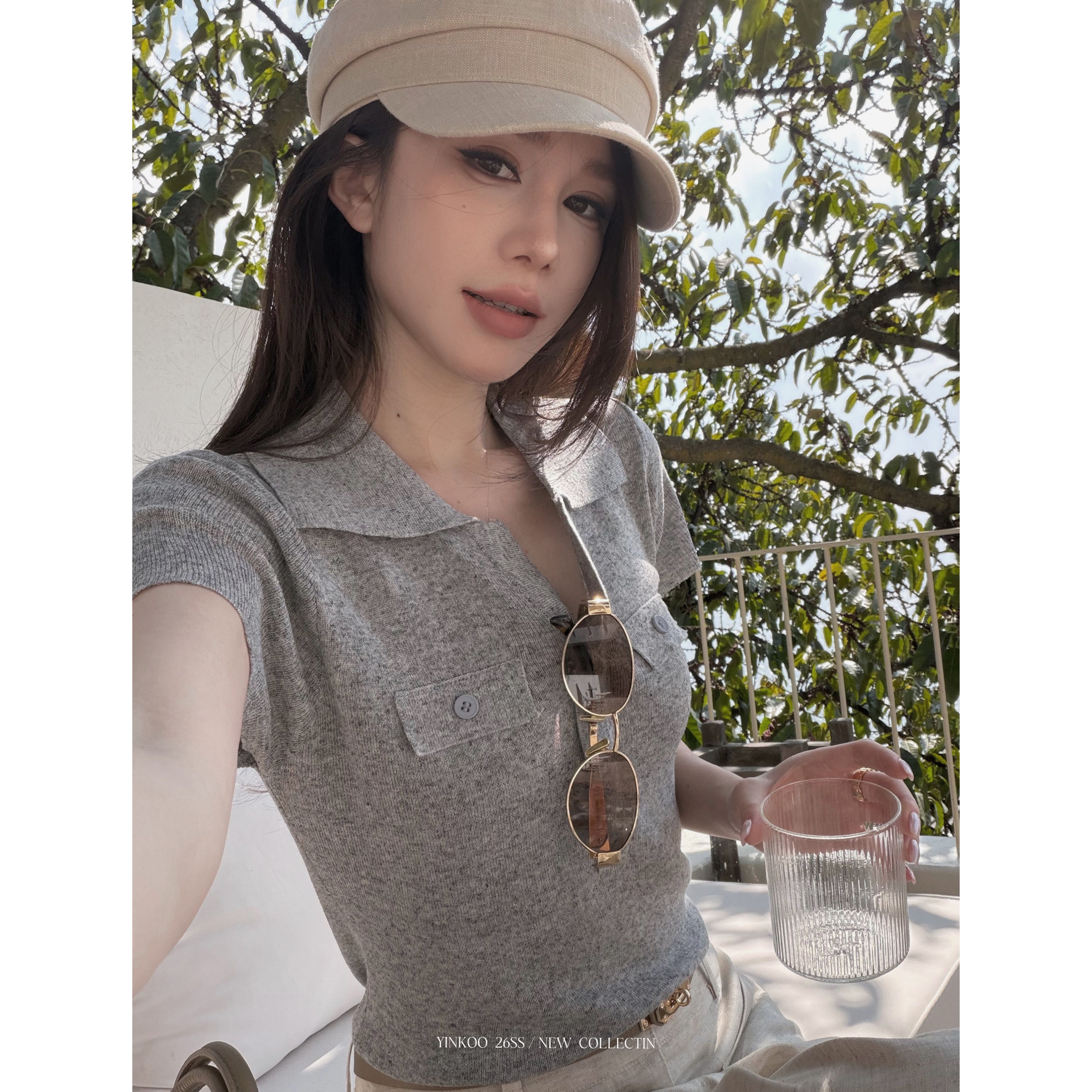 한 부서 chic 블루 회색 스트라이프 니트 반팔 여성 2026 새로운 품격 부드러운 바람 몸매 가꾸기 슬림해 보이는 티셔츠 맨위