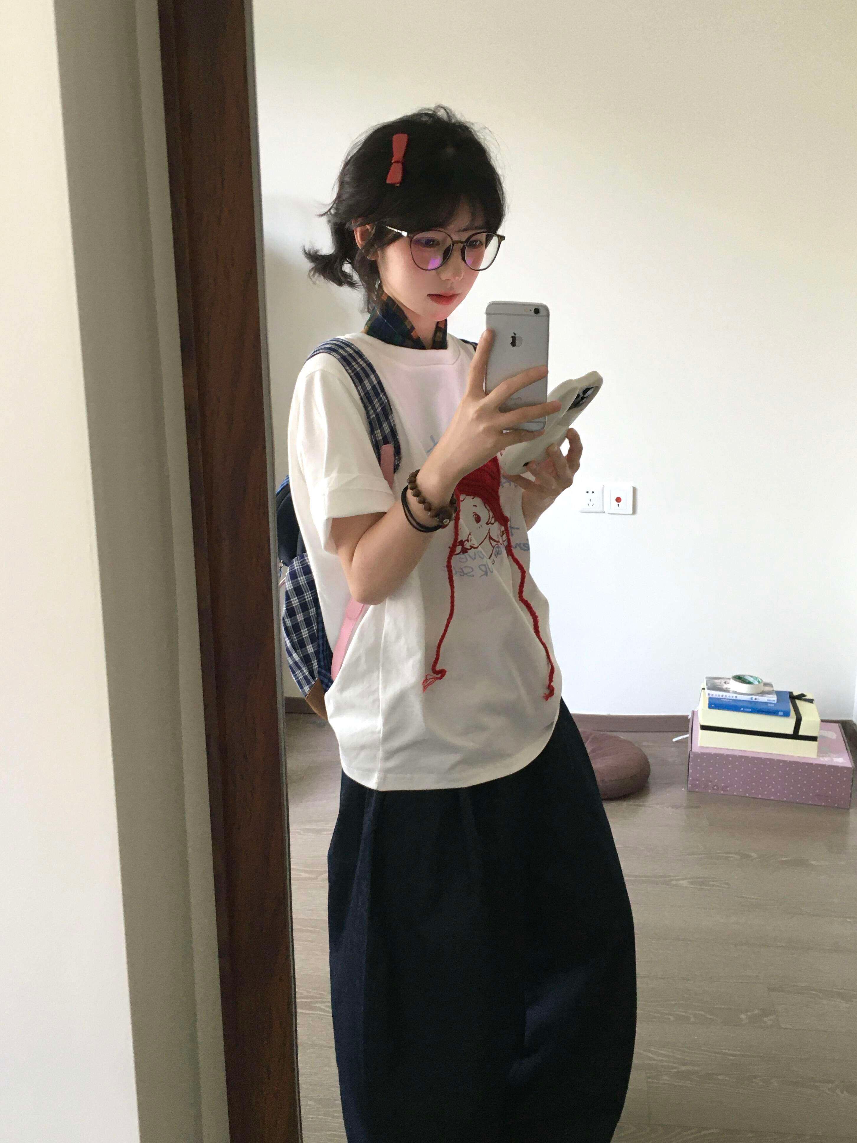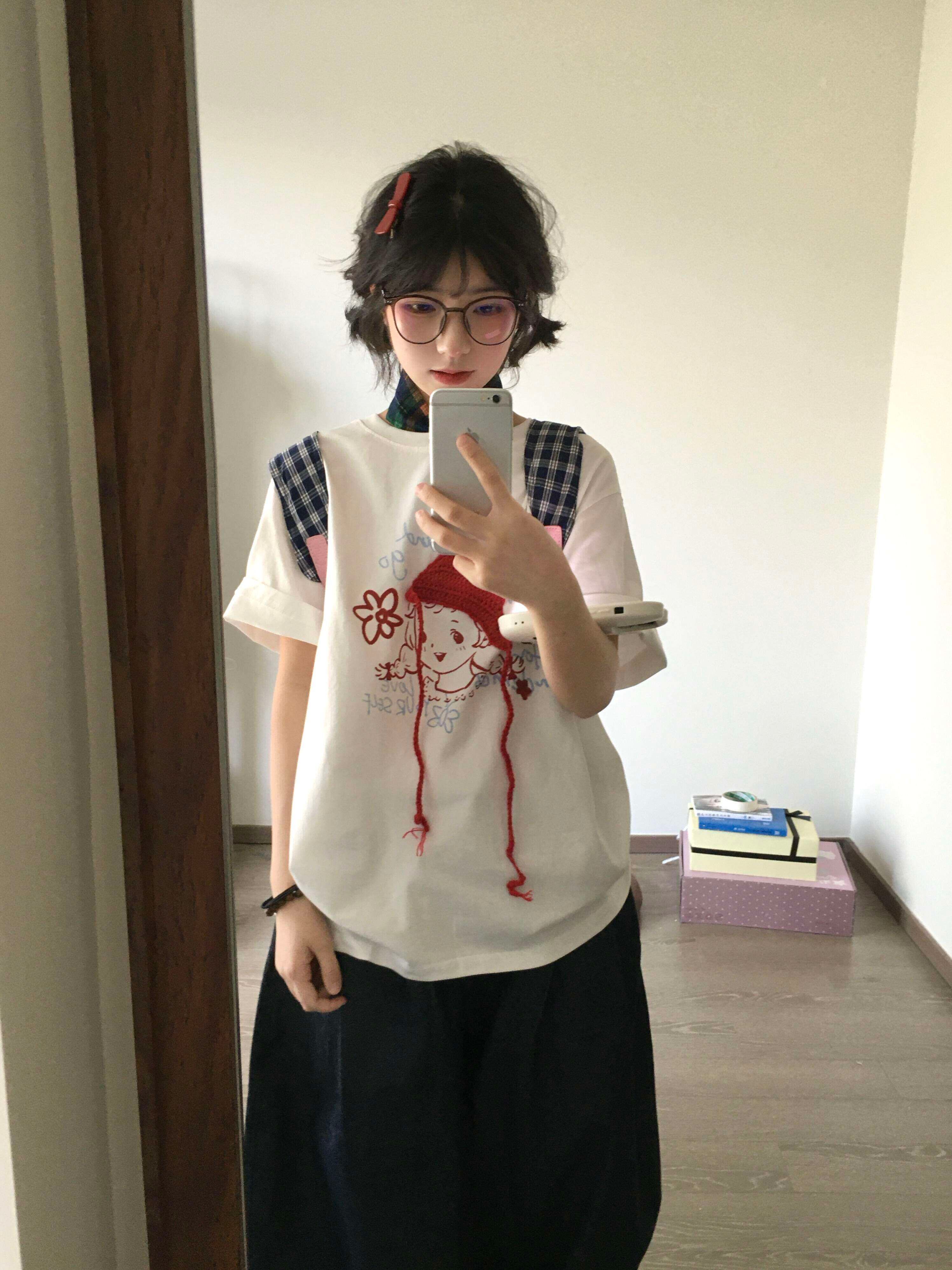 21 220 그램 순면 작은 빨간 모자 디자인 센스 루즈핏 느긋한 바람 반팔 티셔츠 여성 슬림해 보이는 화이트 맨위