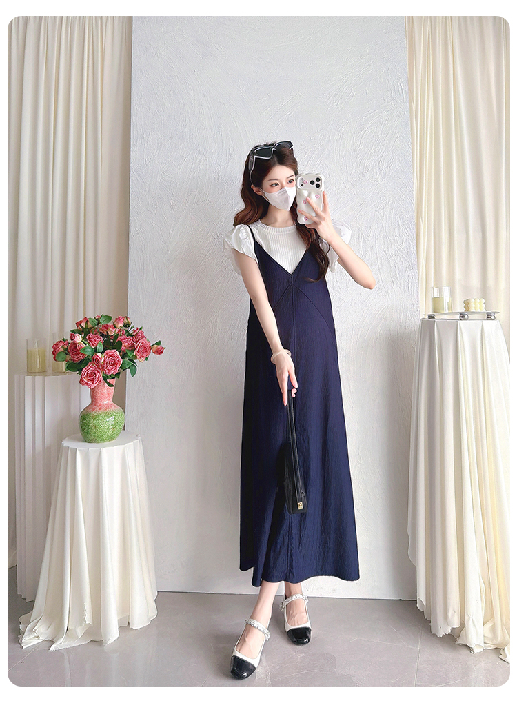 실사 임산부 여름 새로운 패션 빅 사이즈 루즈핏 슬림해 보이는 멜빵 스커트 화이트 t 반팔 투피스 세트