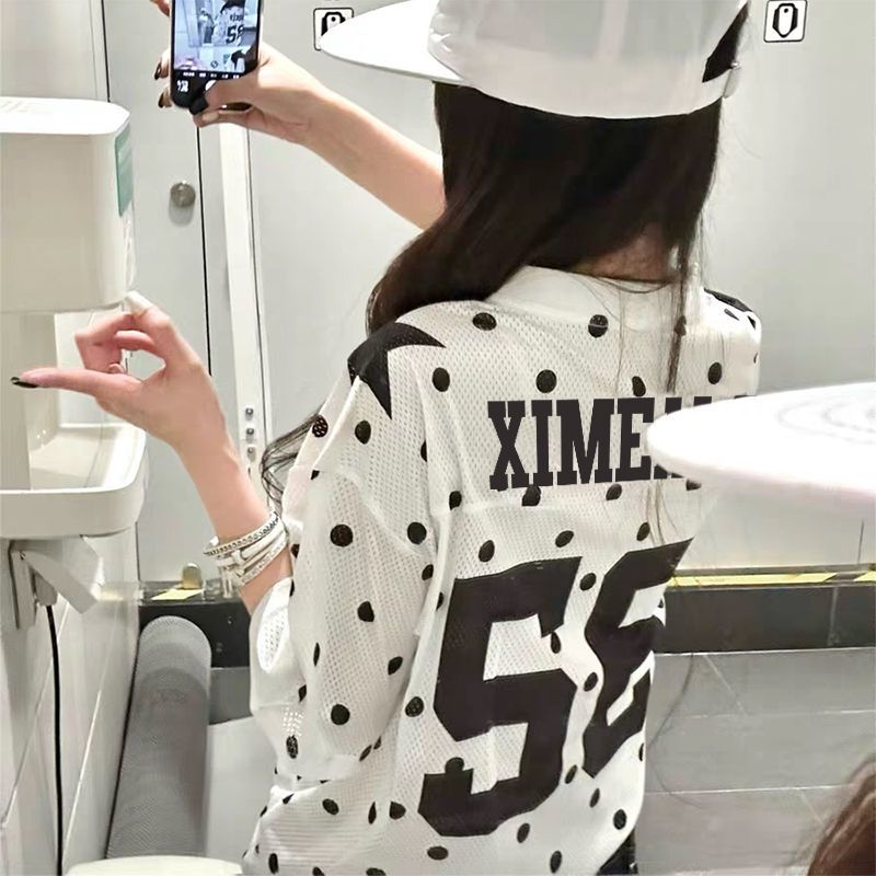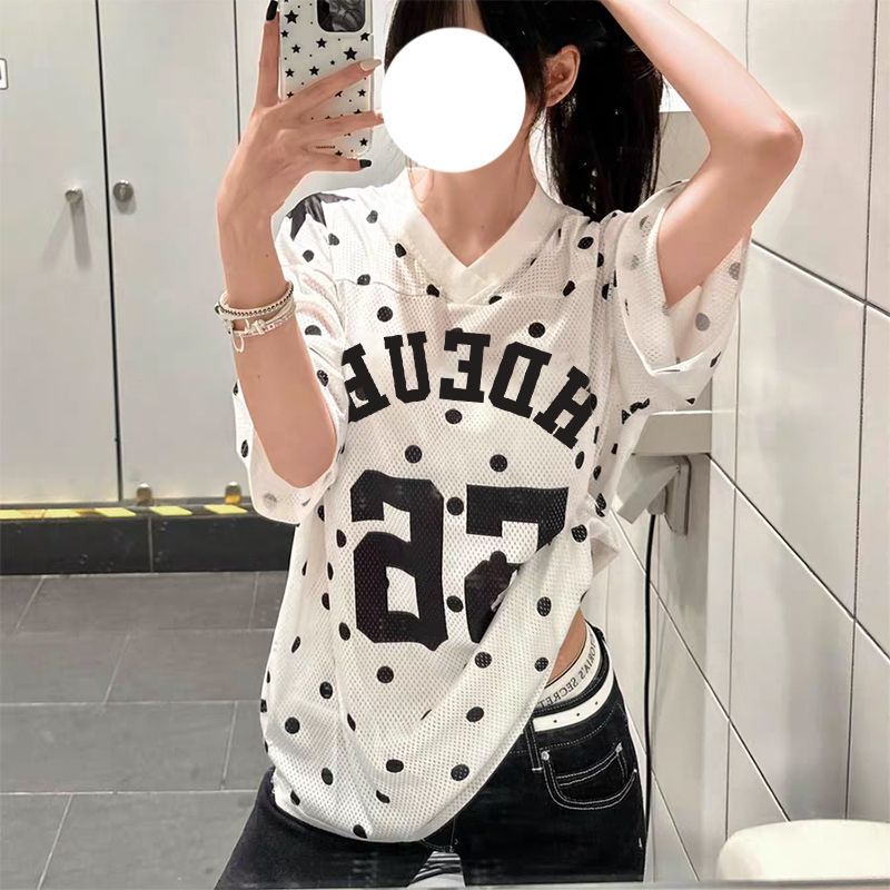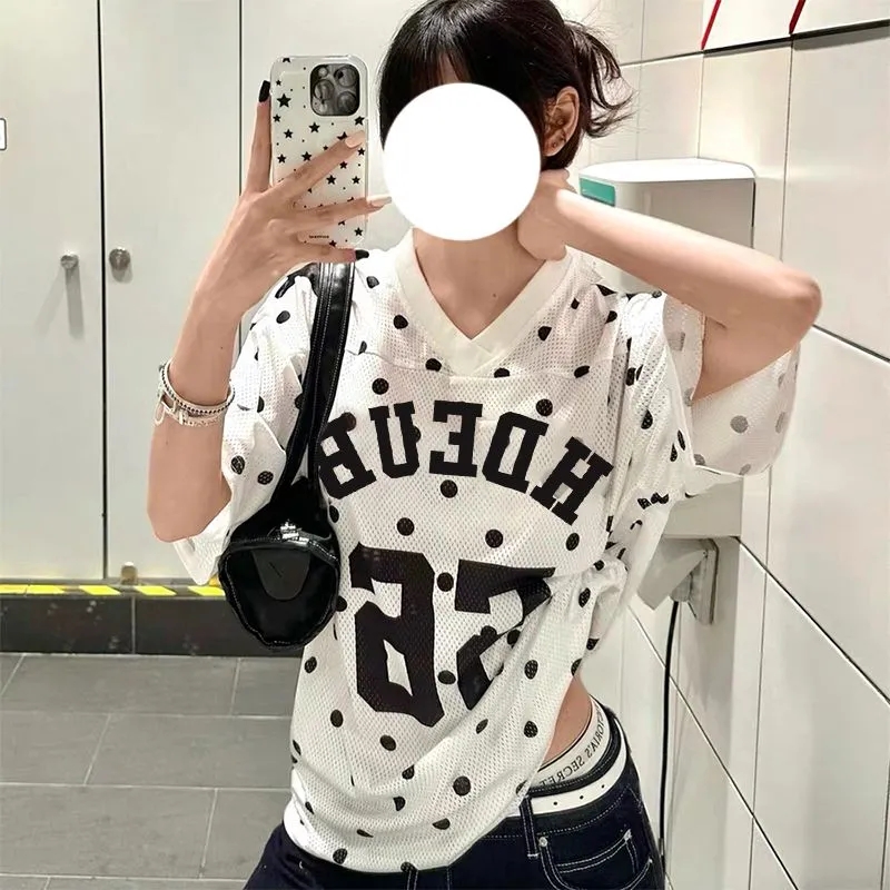 아메리칸 배색 도트 무늬 삽입 어깨 반팔 티셔츠 여성 2026 여름 알파벳 프린트 달콤한 핫걸 몸매 가꾸기 쇼트 스타일 맨위