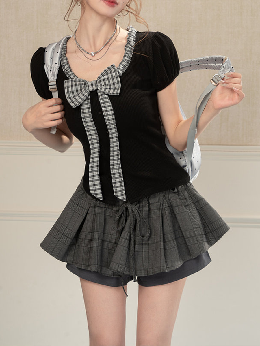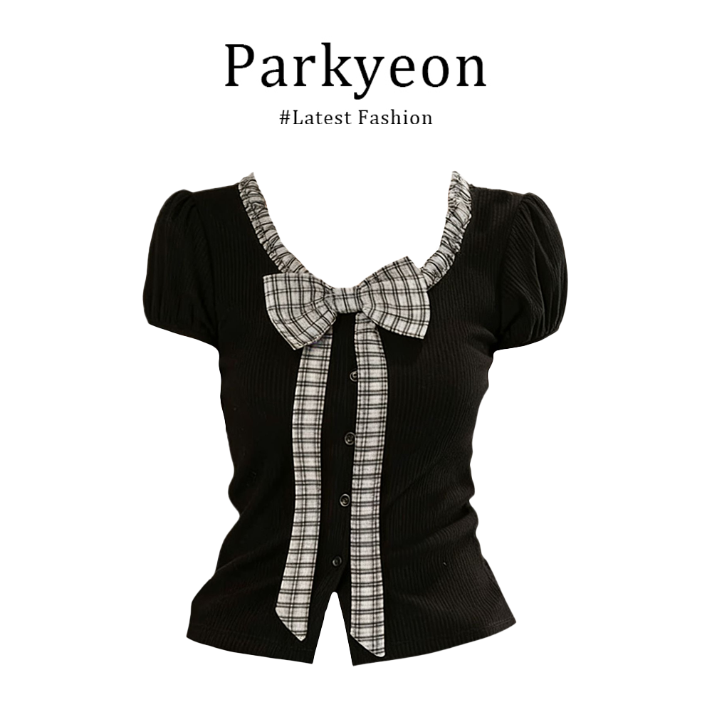 정가 재고 있음 한 부서 나비 매듭 체크무늬 패치워크 반팔 티셔츠 여성 디자인 센스 몸매 가꾸기 슬림해 보이는 다용도 맨위