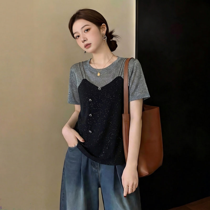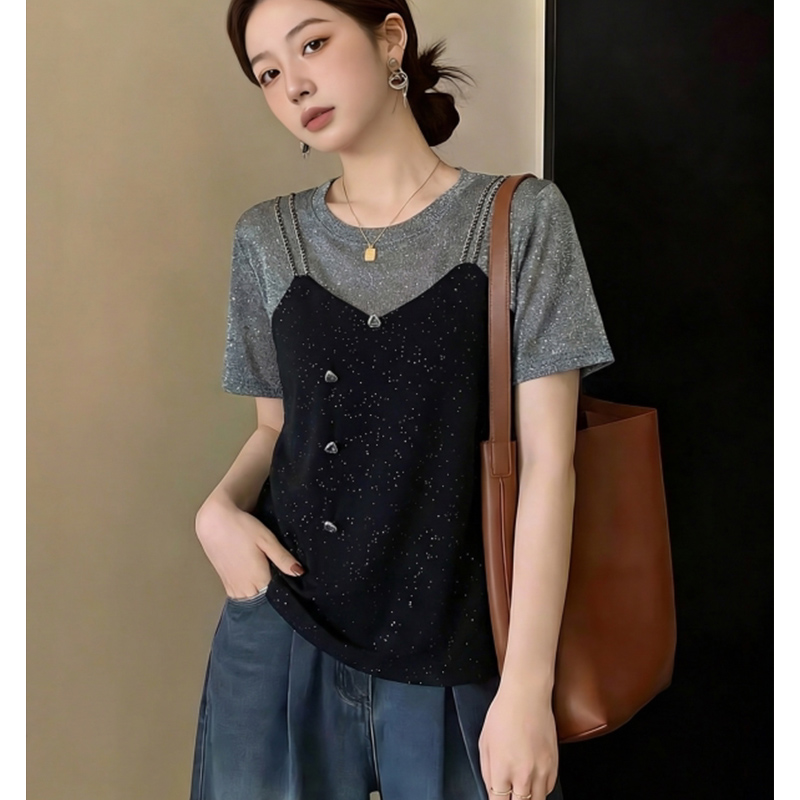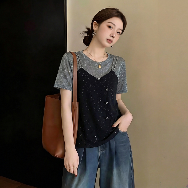 40 차가운 실크 차가운 면 리브 1 1 빅 사이즈 2026 새로운 반팔 여성 여름 페이크 레이어드 슬림해 보이는 맨위