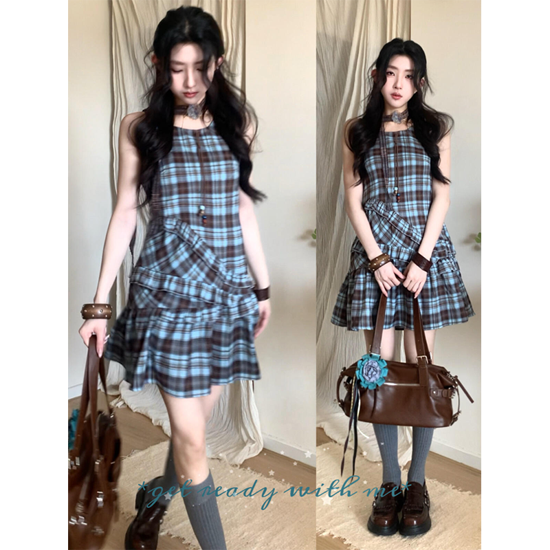 백리스 빨간색 체크무늬 슬립 여성 드레스 여름 새로운 프랑스식 전원 바람 몸매 가꾸기 허리 수축 슬림해 보이는 길다 치마