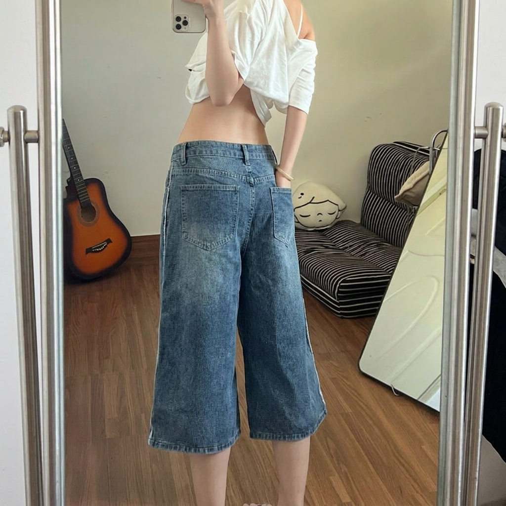 아메리칸 워싱 찢어진 부분 넓은 다리 데님 바지 여성 새로운 하이웨이스트 루즈핏 슬림해 보이는 표지 고기 스트레이트 7부 바지 y2k