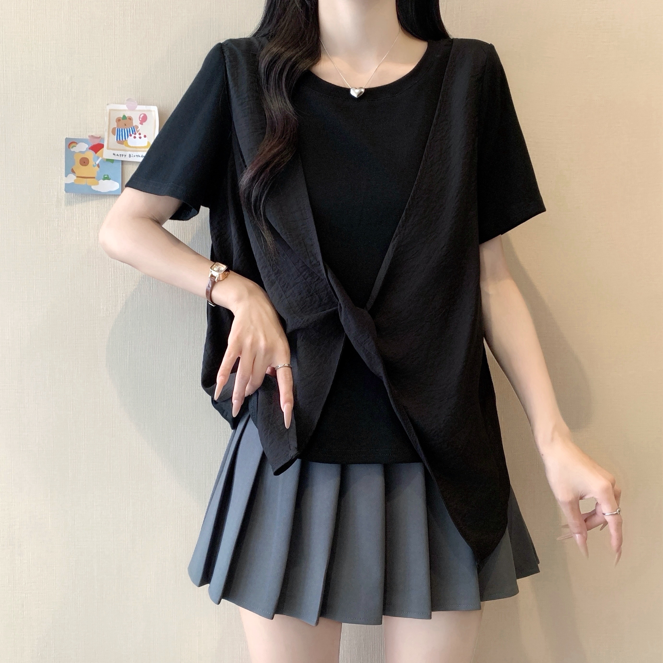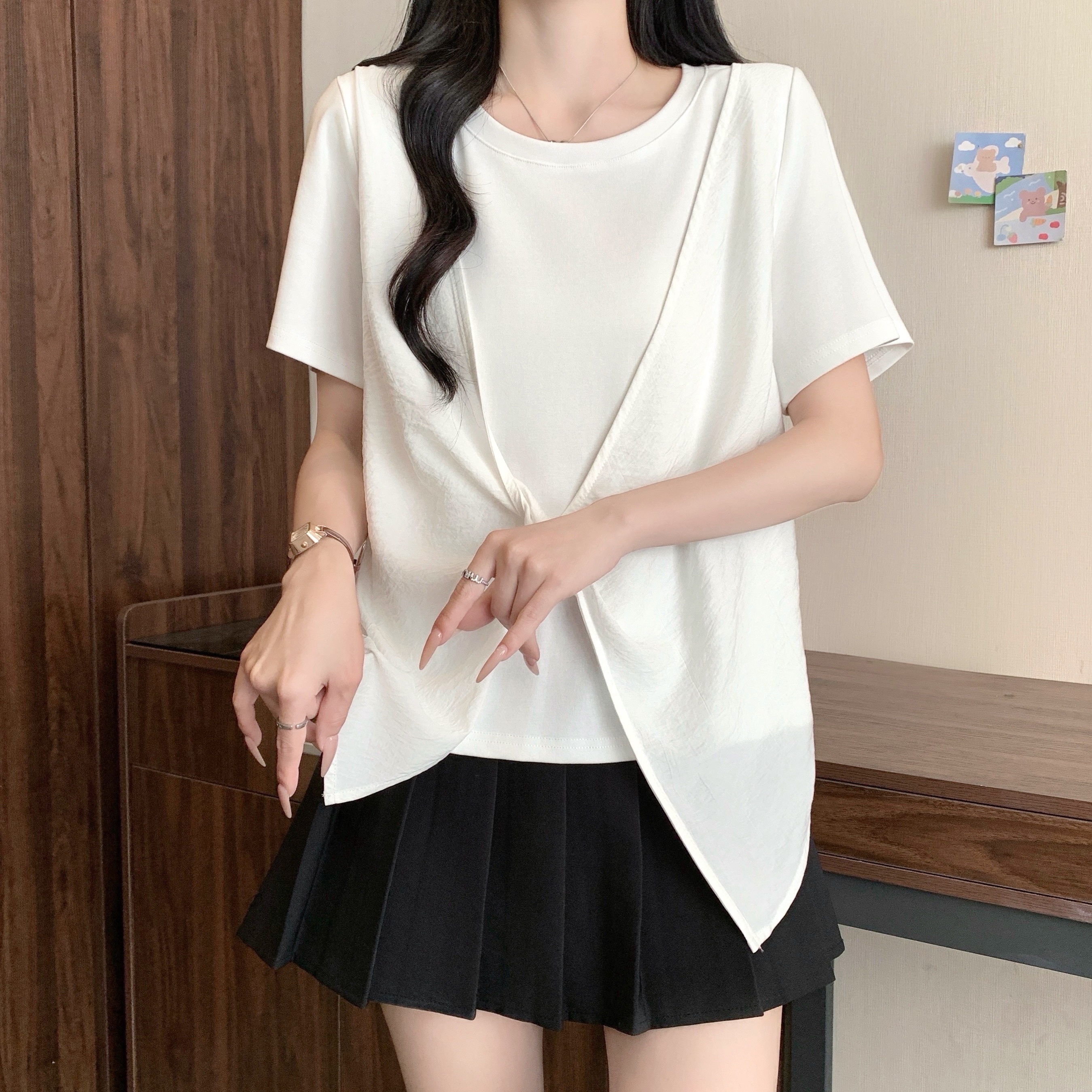 실사 정가 여름 새로운 빅 사이즈 페이크 레이어드 반팔 티셔츠 여성 긍정적 인 어깨 디자인 슬림해 보이는 맨위