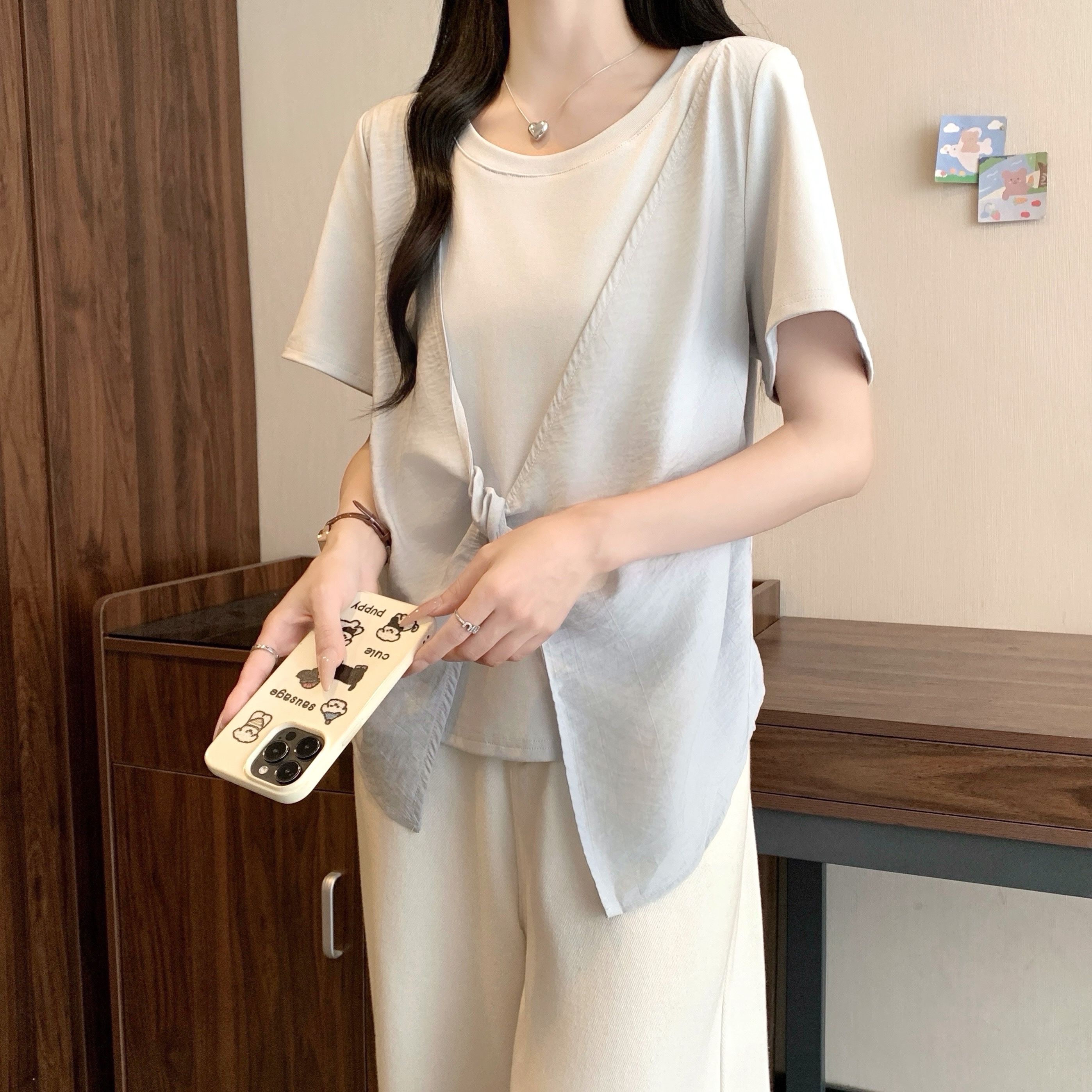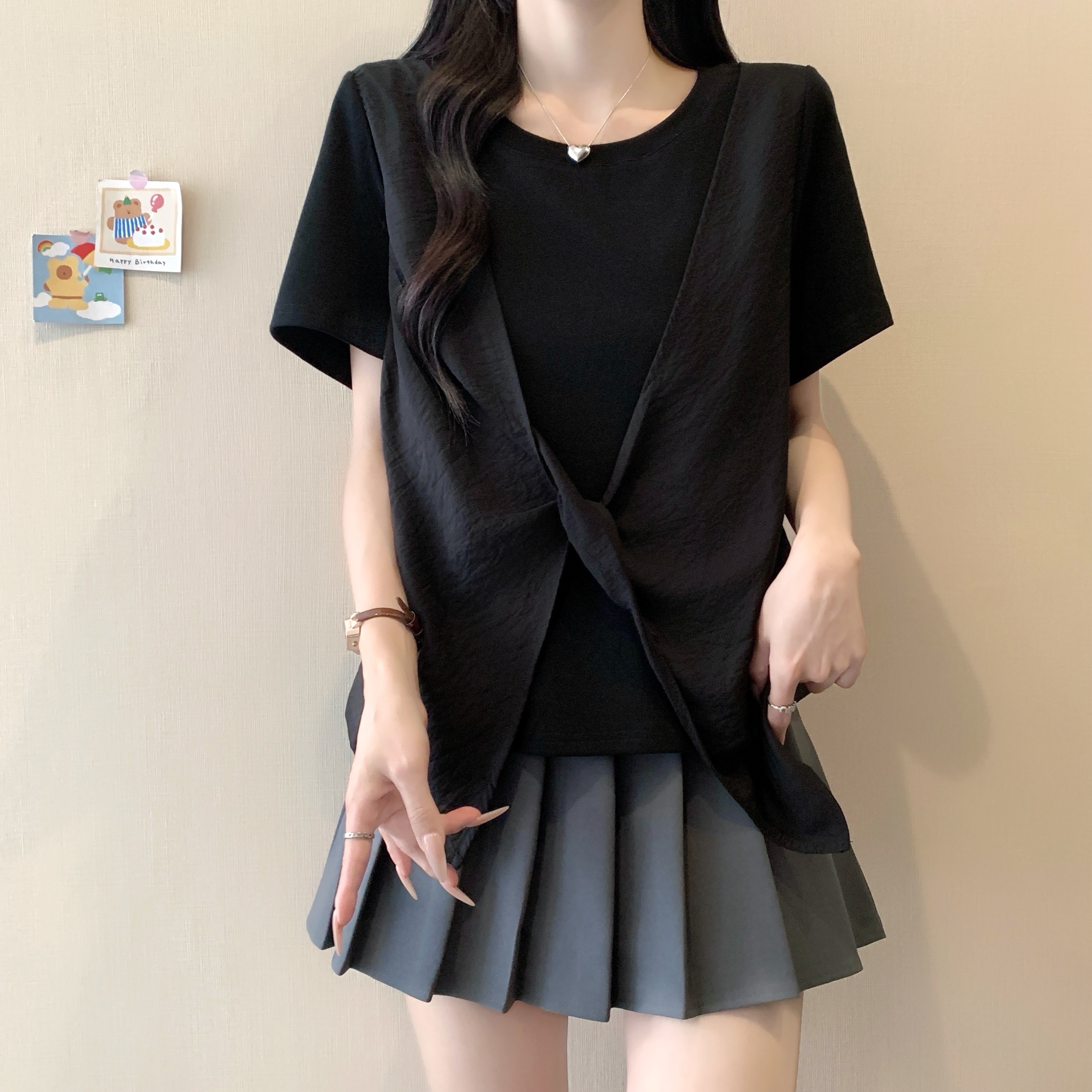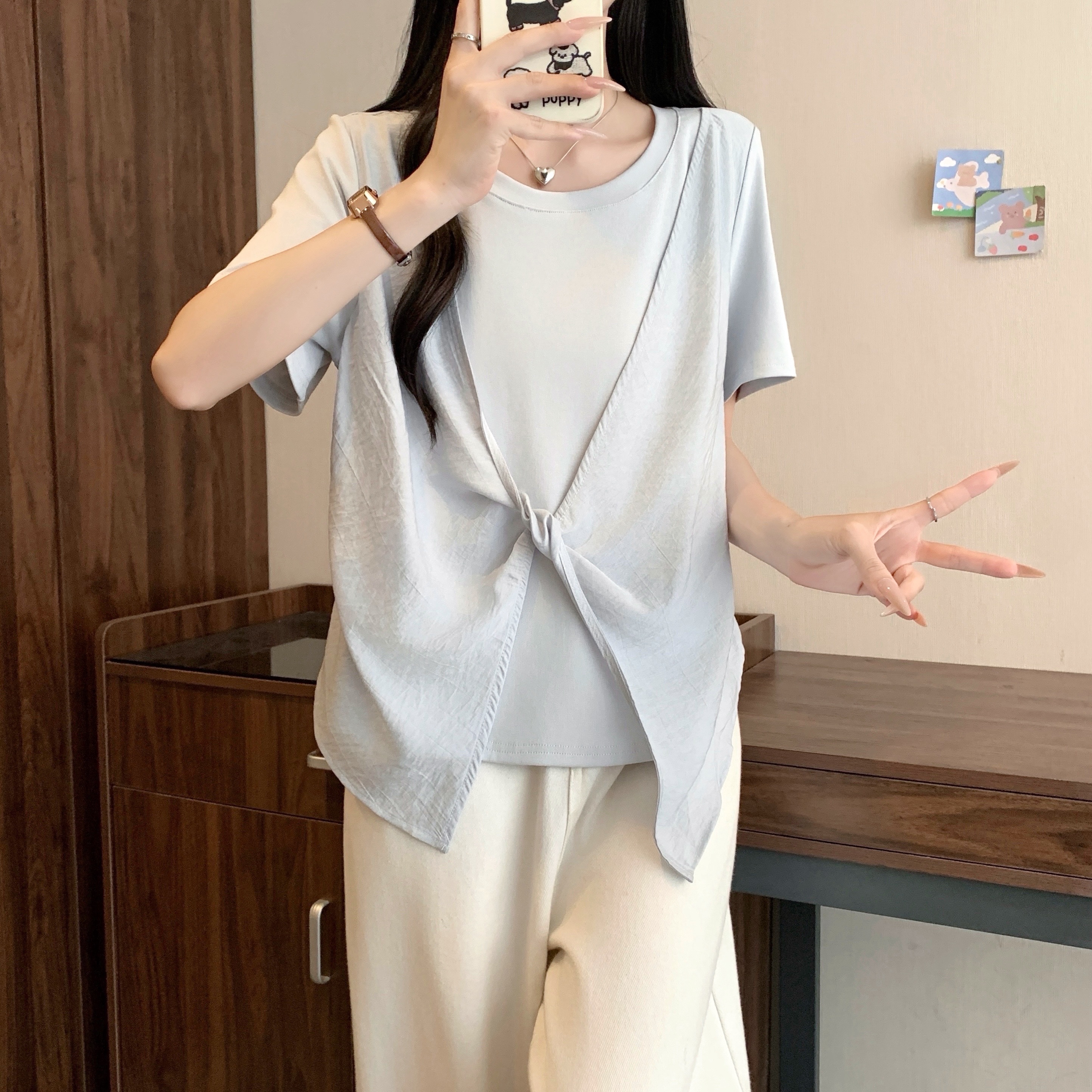 실사 정가 여름 새로운 빅 사이즈 긍정적 인 어깨 슬림해 보이는 페이크 레이어드 나비 매듭 디자인 센스 반팔 티셔츠 여성