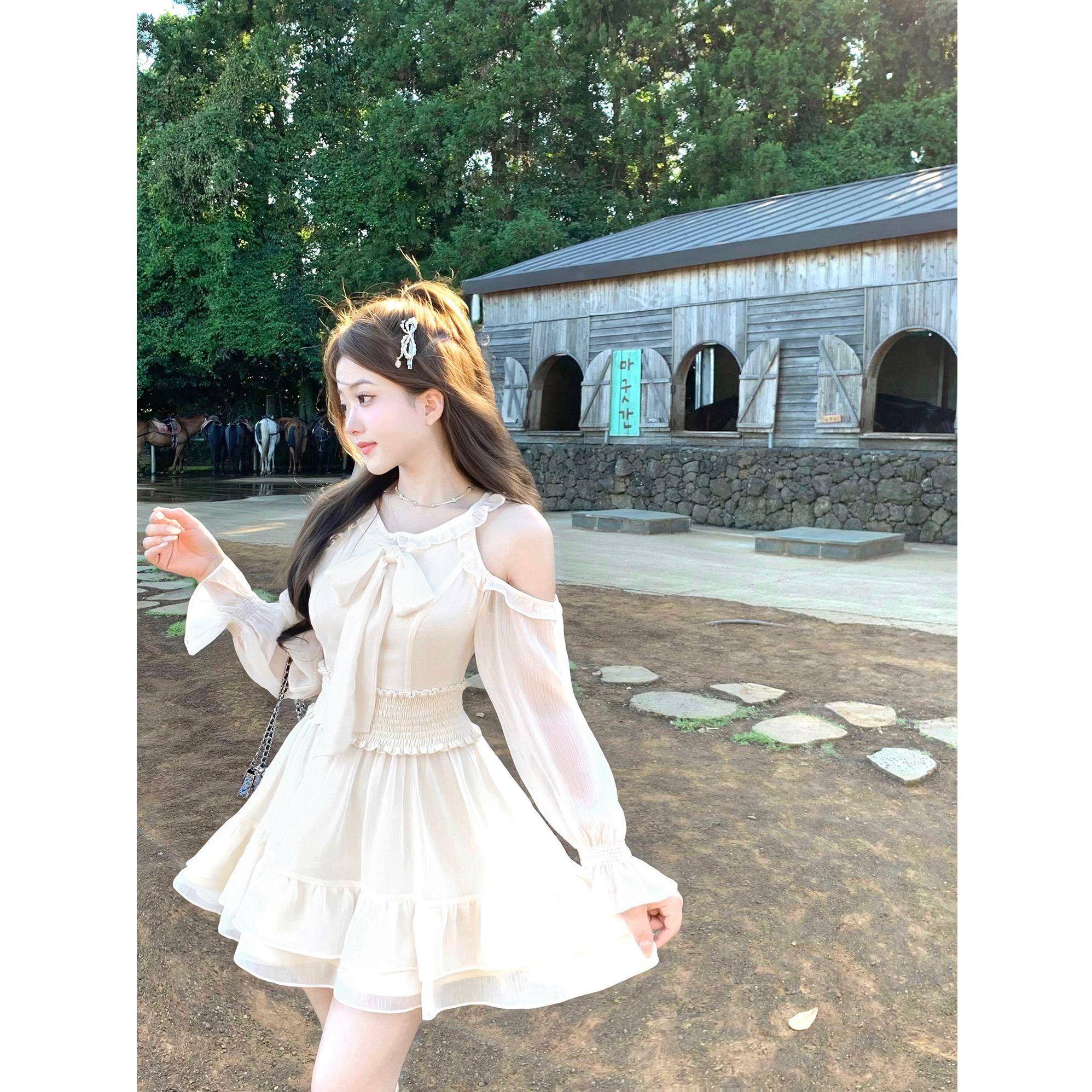 빅 사이즈 여성 의류 프랑스식 레트로 나비 매듭 튜브탑 드레스 천 골드 허리 수축 치마