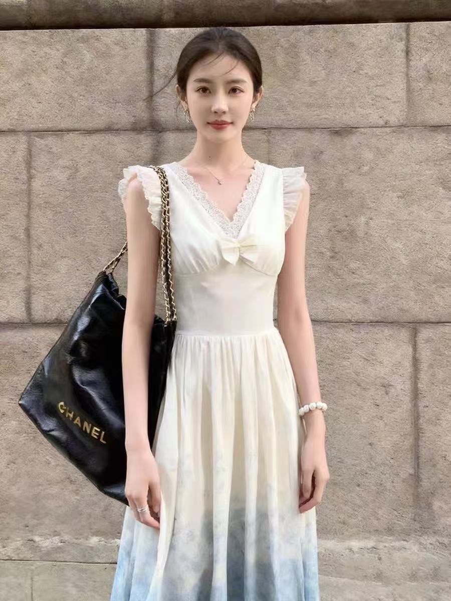 2026 자이언트 잘 생긴 아름다운 아니요 명중 섹션 프랑스식 부드러운 휴가 화이트 나비 매듭 작은 날다 소매 여성 드레스 여름