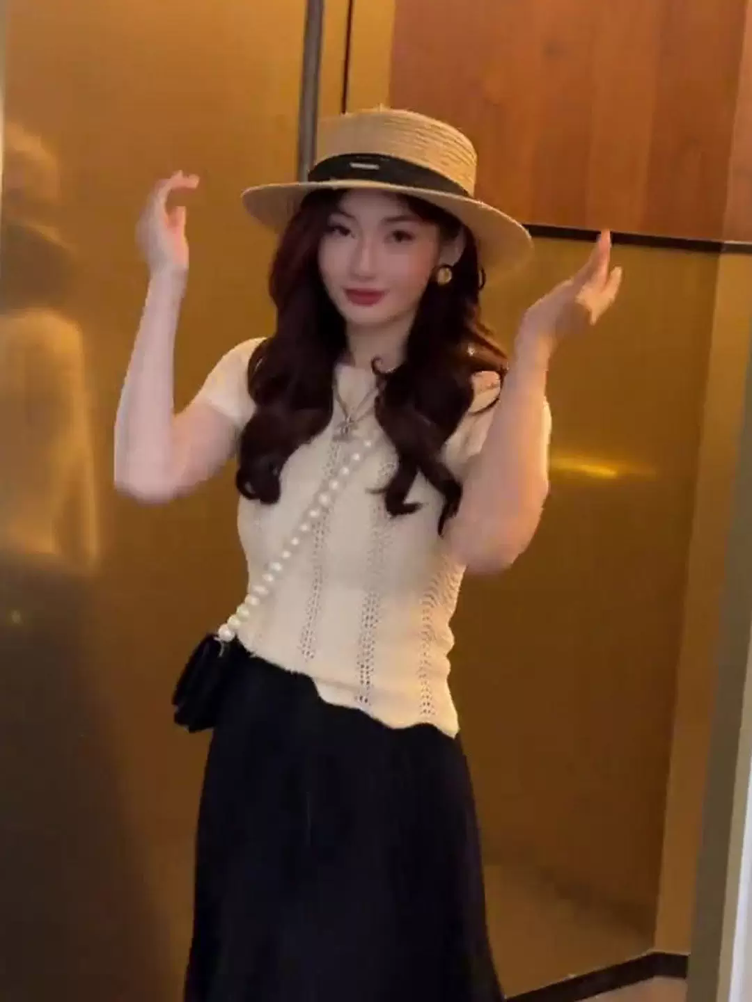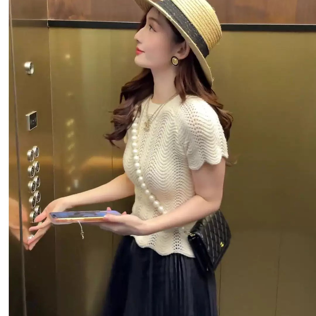 프랑스식 레트로 물결무늬 측면 홀로우 아웃 반팔 니트 스웨터 여성 여름 몸매 가꾸기 슬림해 보이는 고유 한 아름다운 쇼트 스타일 맨위 얇은