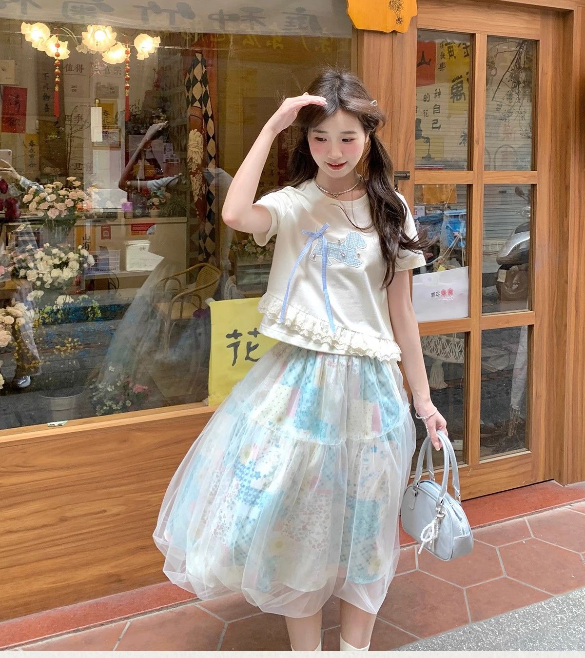 하트 만화 프린트 비스듬한 칼라 반팔 티셔츠 여성 2026 년 여름 새로운 레이스 측면 패치워크 트임 오프숄더 맨위