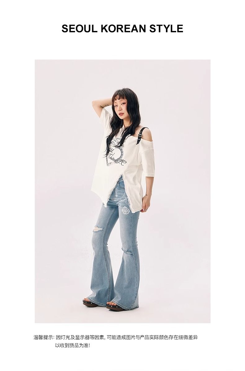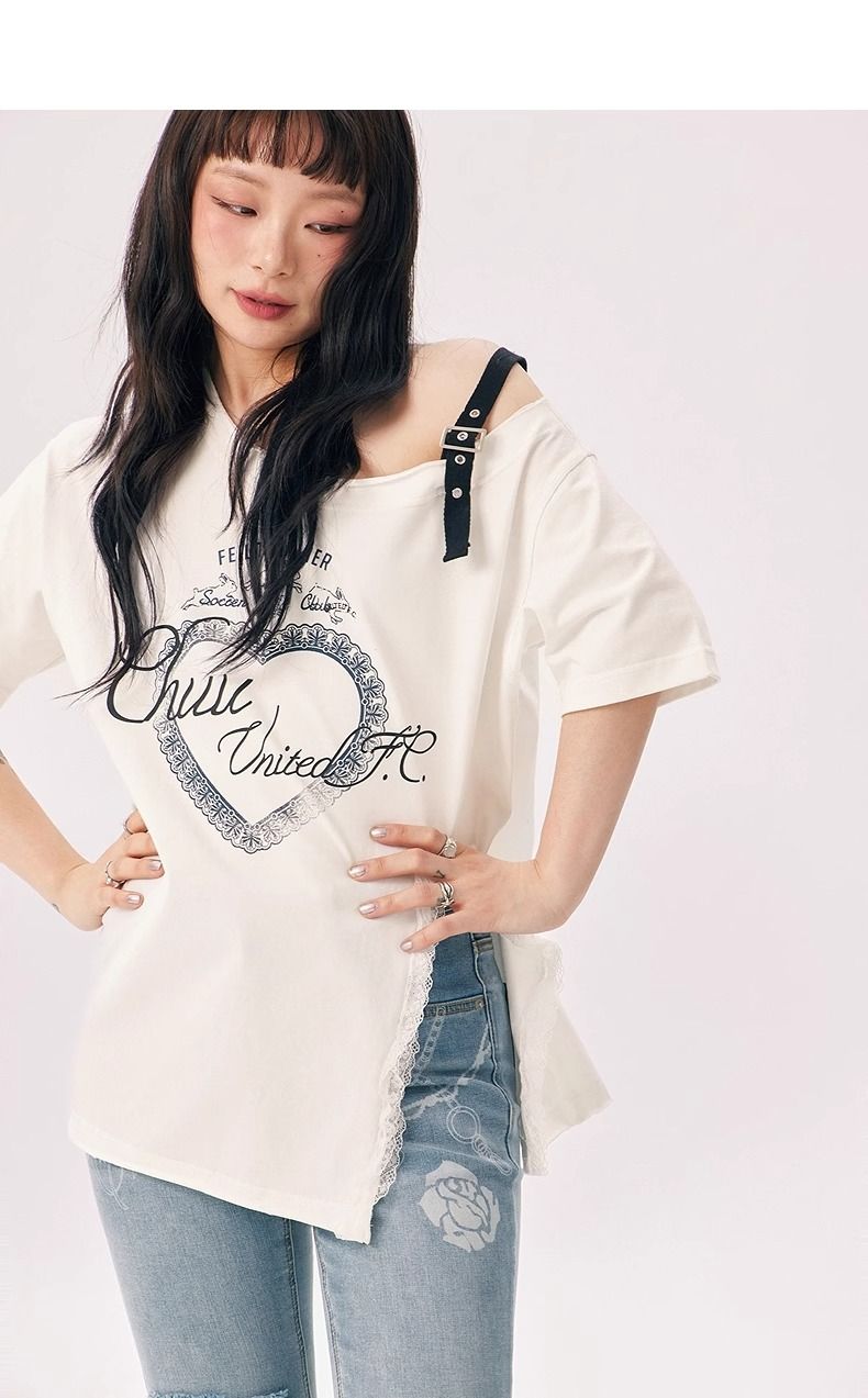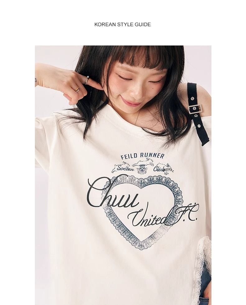 하트 만화 프린트 비스듬한 칼라 반팔 티셔츠 여성 2026 년 여름 새로운 레이스 측면 패치워크 트임 오프숄더 맨위