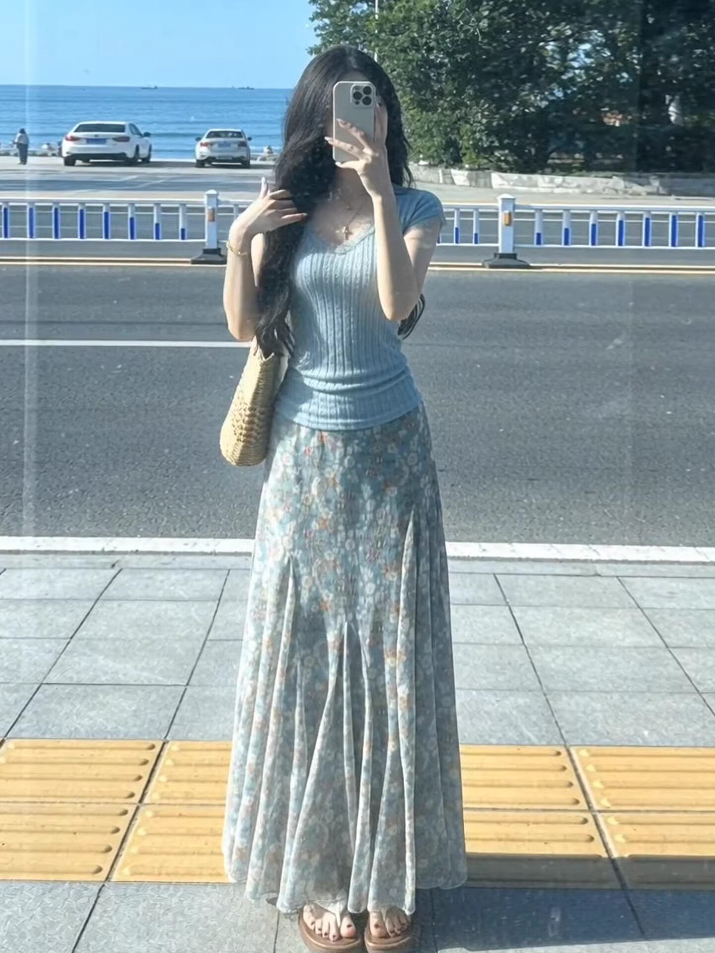 여름 착용 가져 가라. 세트 여성 빅 사이즈 지방 mm 허리 수축 맨위 반신 스커트 품격 부드러운 느슨함 센스 잘 생긴 드레스