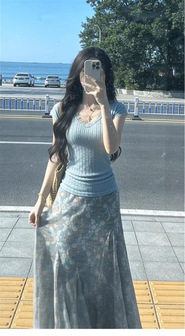 초여름 아름다운 세트 한 부서 파란색 반팔 티셔츠 꽃무늬 반신 스커트 자이언트 잘 생긴 고유 한 연령 감소 두 조각 여성 세트