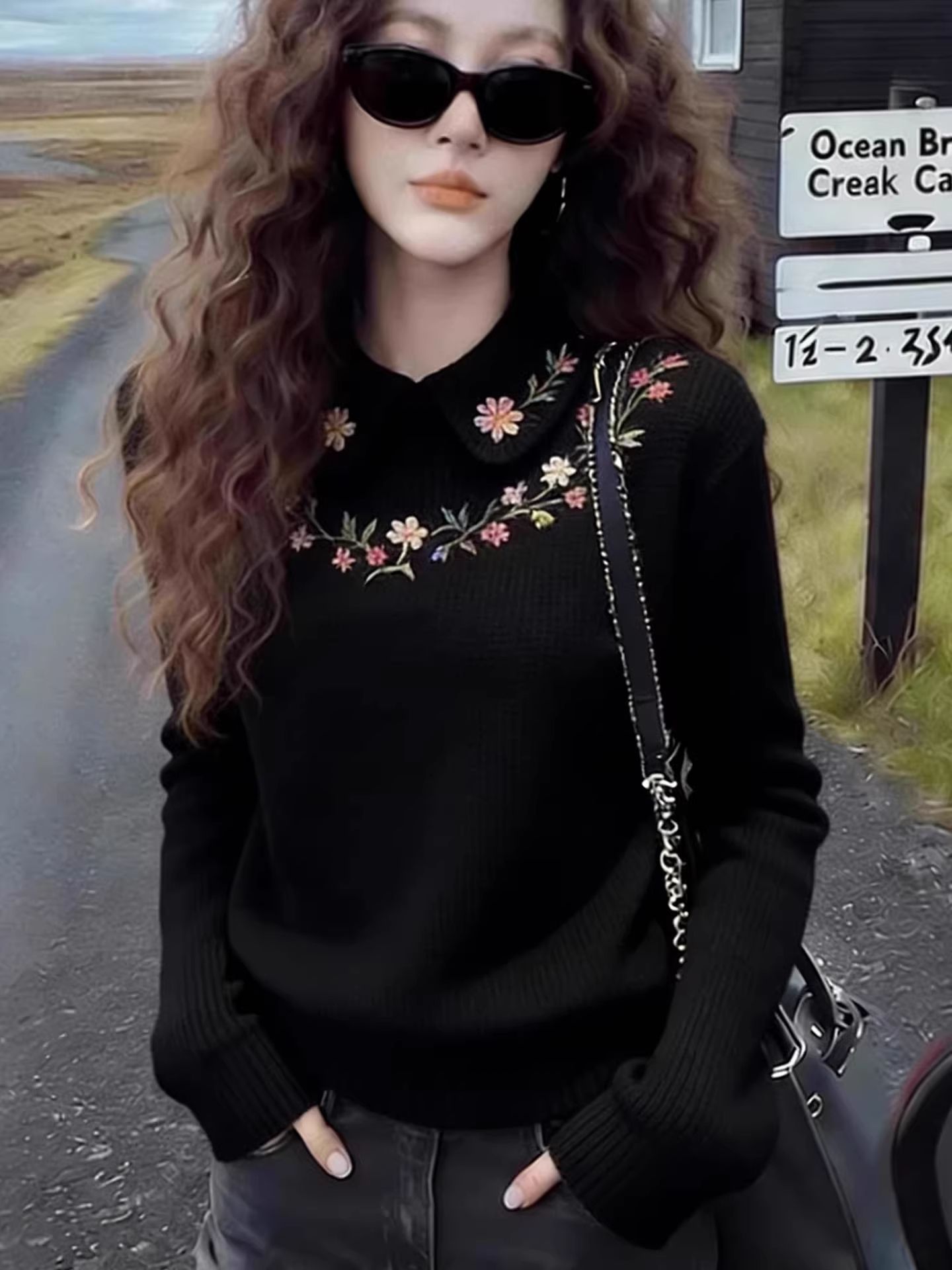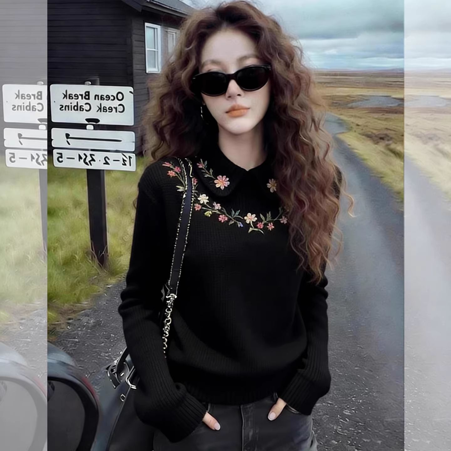 검정색 폴로 칼라 자수 꽃 여성 의류 봄 가을 2026 새로운 세련된 연령 감소 패션 미니멀리즘 맨위 만나는 몸매 가꾸기