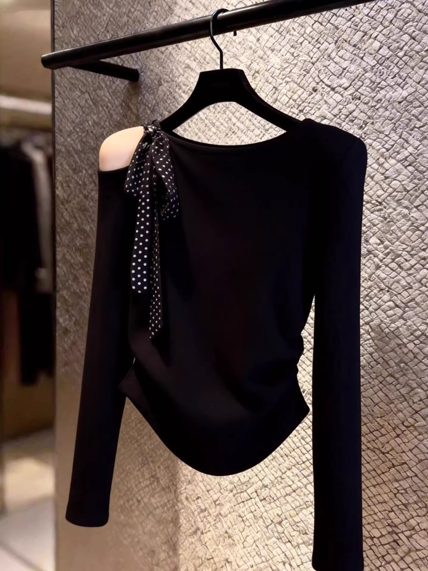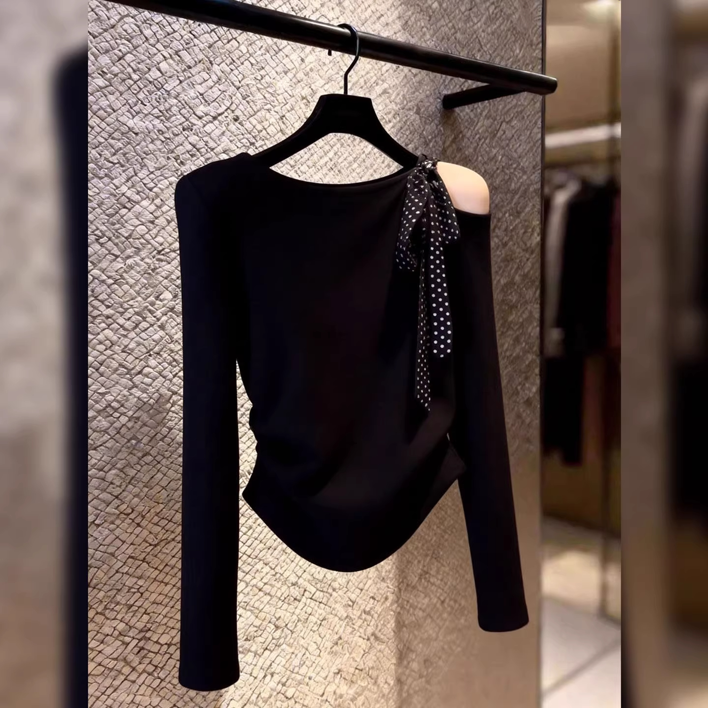 2026 빅 사이즈 디자인 센스 도트 무늬 레이스업 오프숄더 긴팔 티셔츠 여성 봄 새로운 지방 mm 슬림해 보이는 표지 고기 맨위