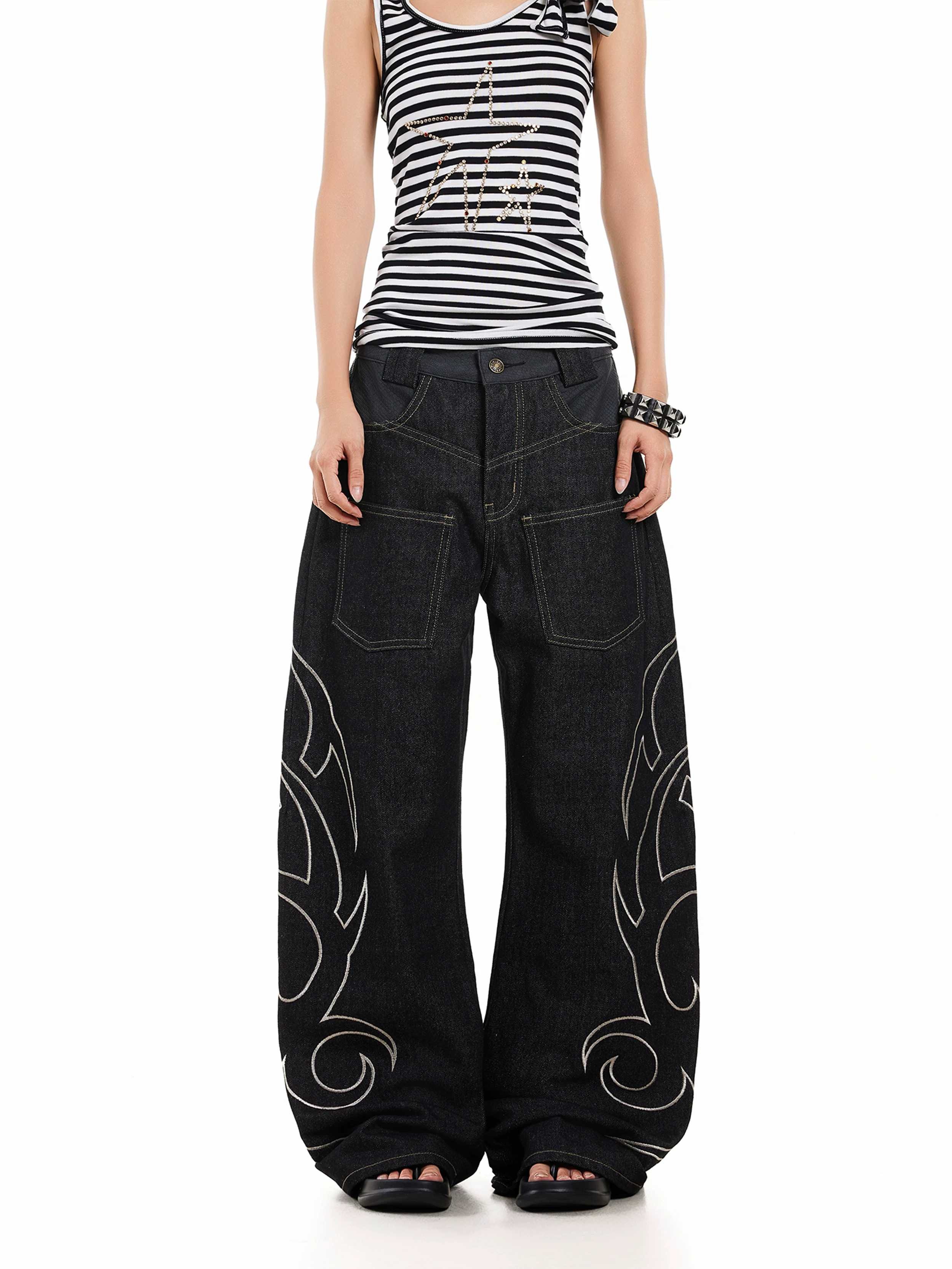 아메리칸 레트로 스타일 거리 작은 대중 토템 자수 청바지 여성 cleanfit 출퇴근 루즈핏 넓은 다리 모통이 칼 바지