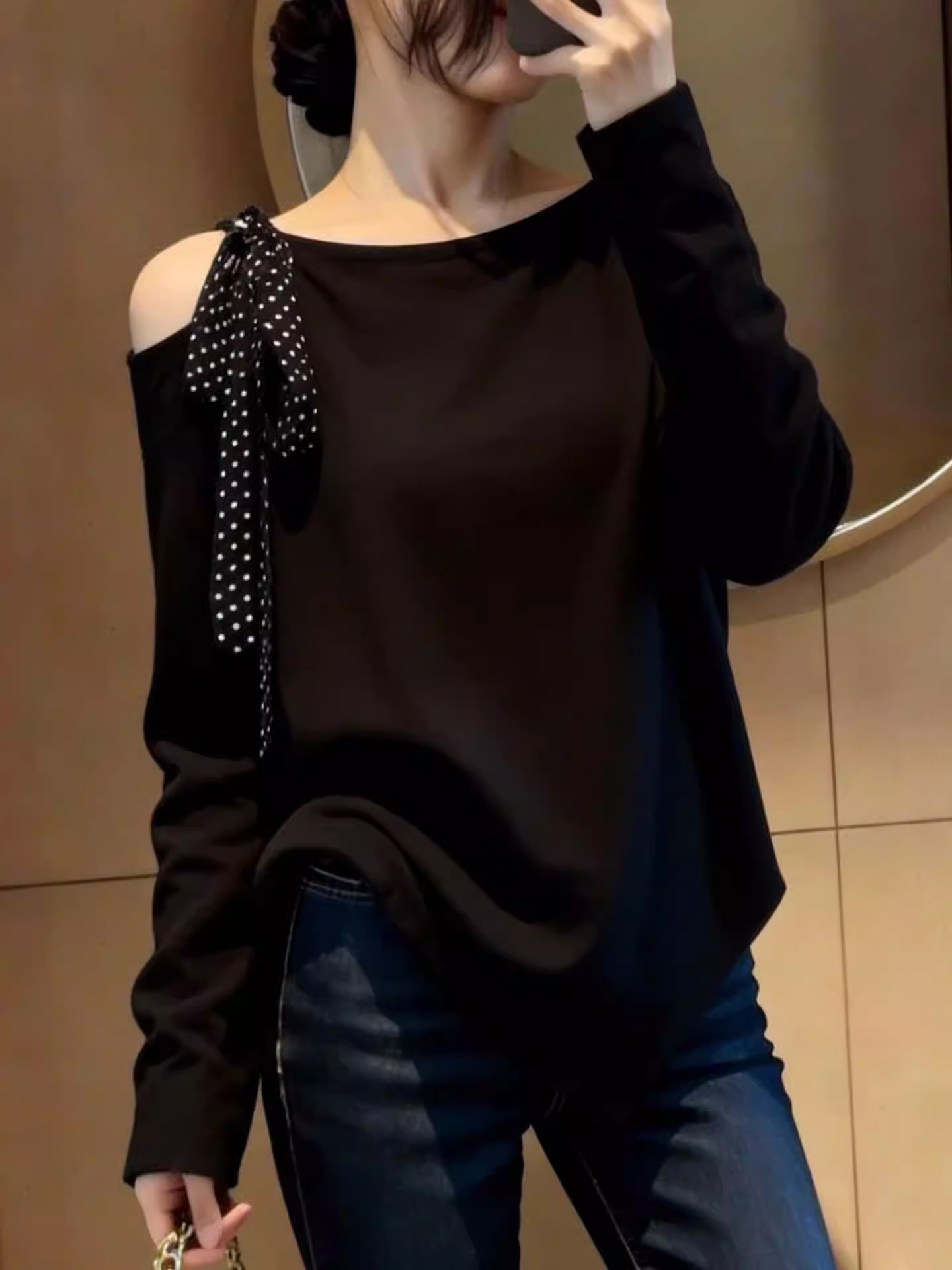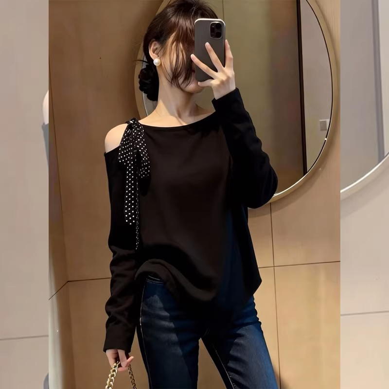 2026 빅 사이즈 디자인 센스 도트 무늬 레이스업 오프숄더 긴팔 티셔츠 여성 봄 새로운 지방 mm 슬림해 보이는 표지 고기 맨위