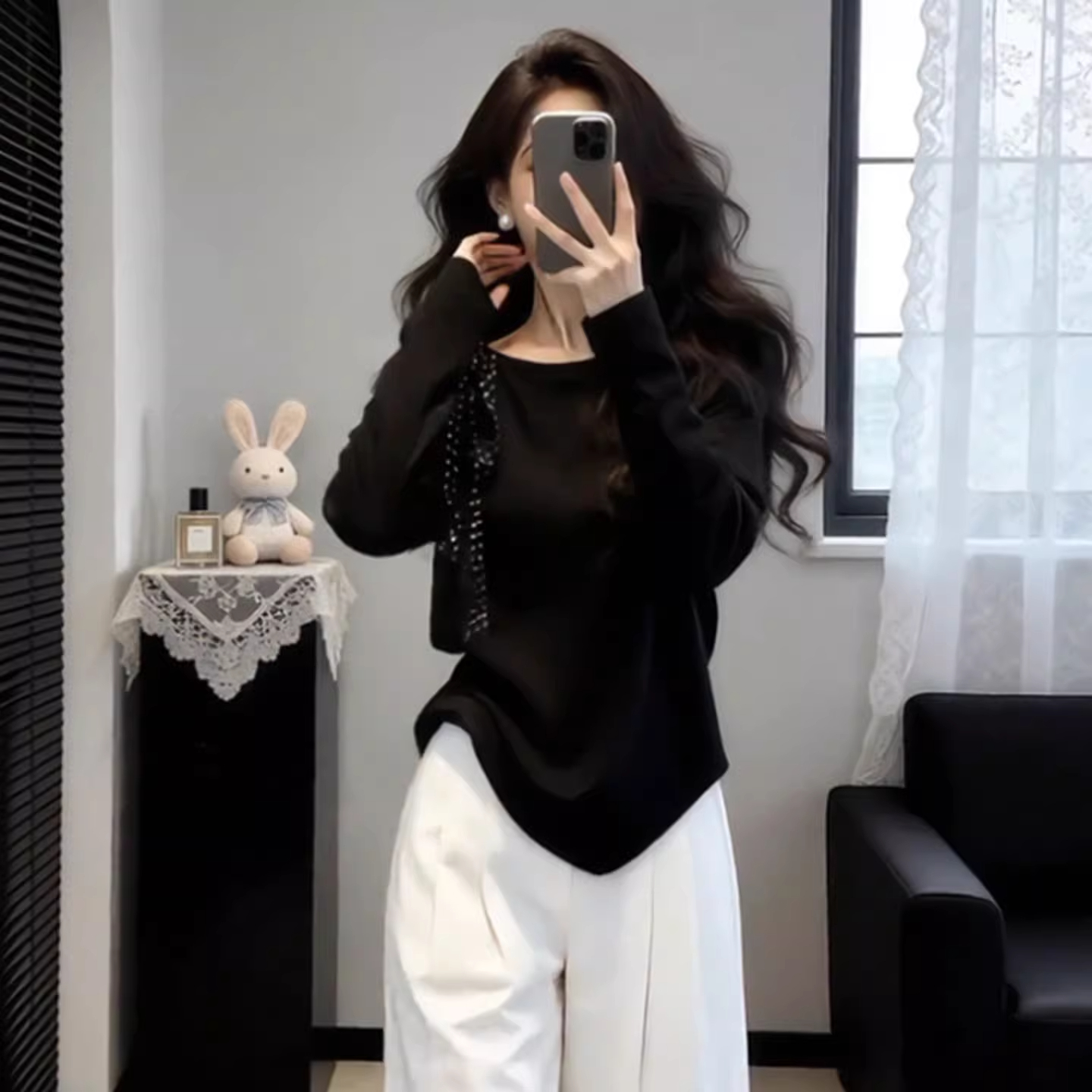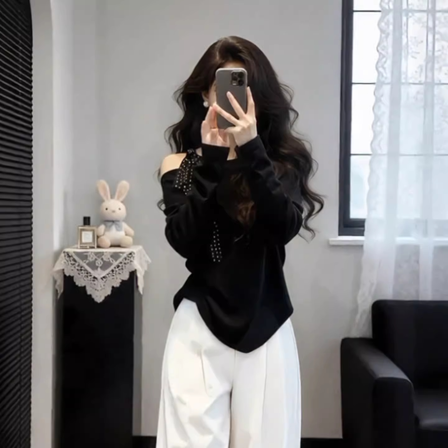 한 부서 품격 작은 대중 아니요 명중 섹션 검정색 오프숄더 긴팔 티셔츠 여성 의류 2026 봄 여름 새로운 그레이트 봐. 의류