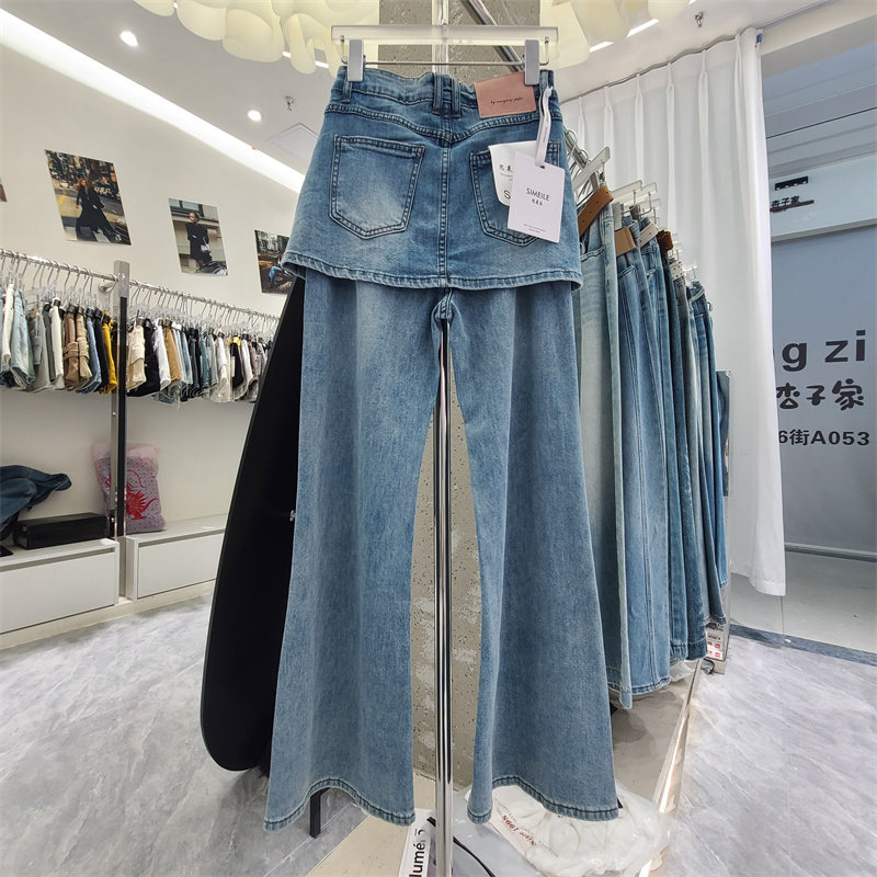 한 여성 방귀 커튼 청바지 워시 물 페이크 레이어드 넓은 다리 방귀 커튼 플레어 바지