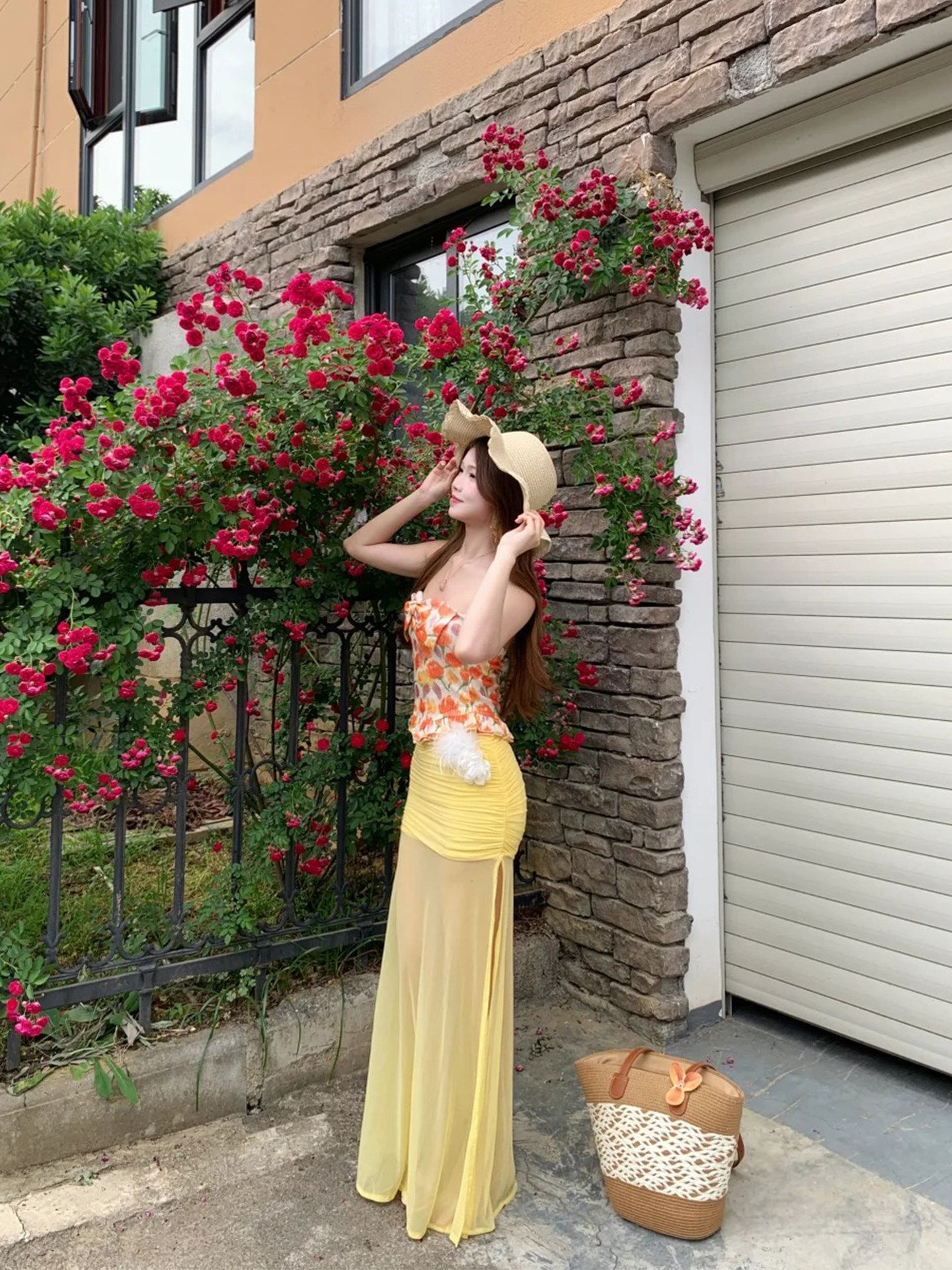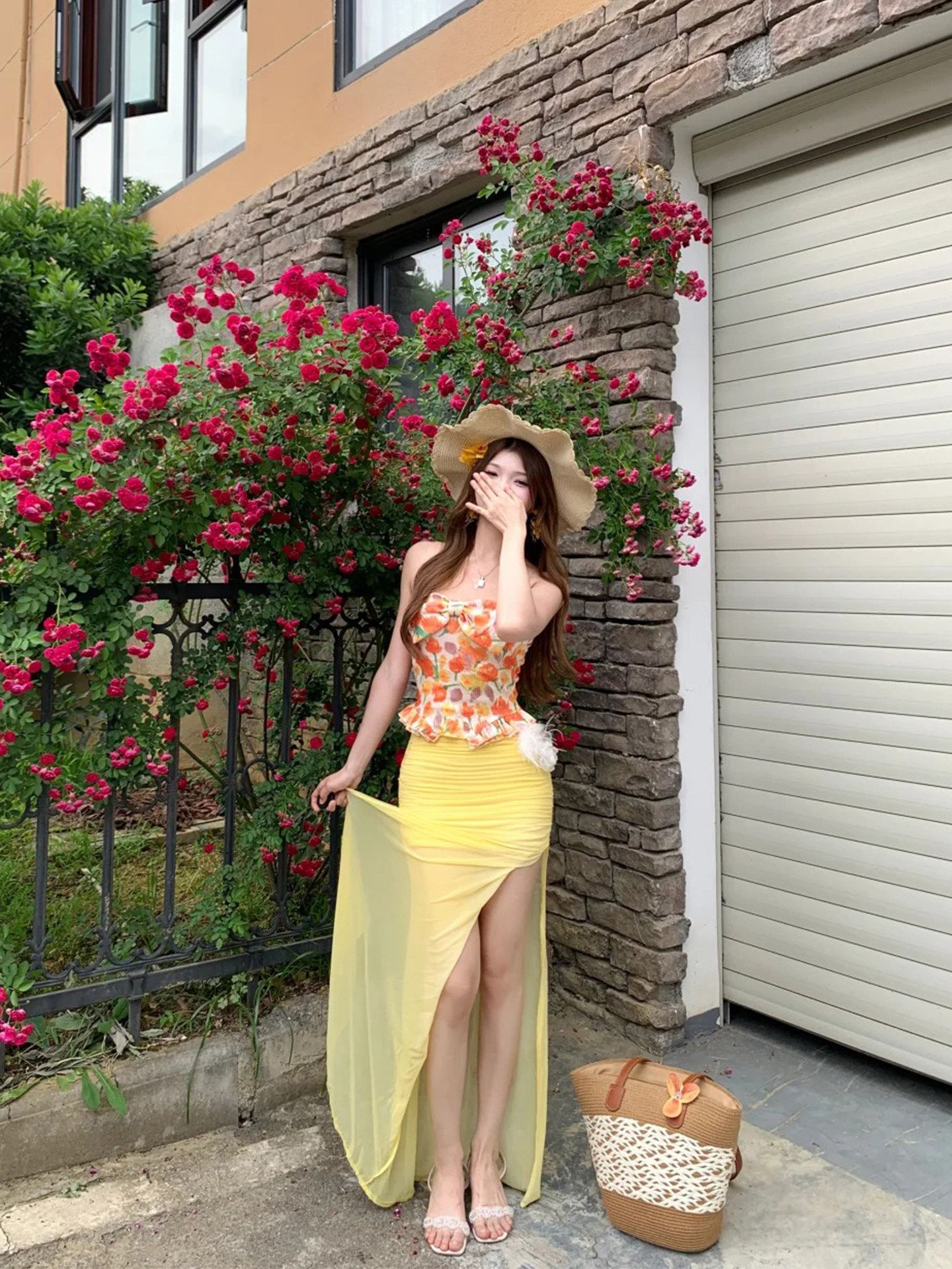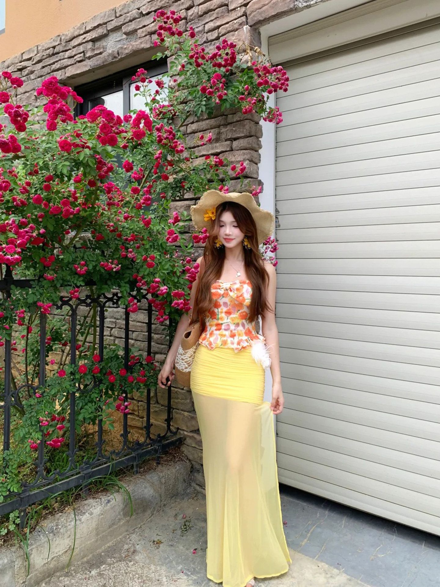 해변가 휴가 도파민 황색 꽃무늬 튜브탑 여성 드레스 자이언트 잘 생긴 분위기 센스 해변 롱 스커트 세트 여성