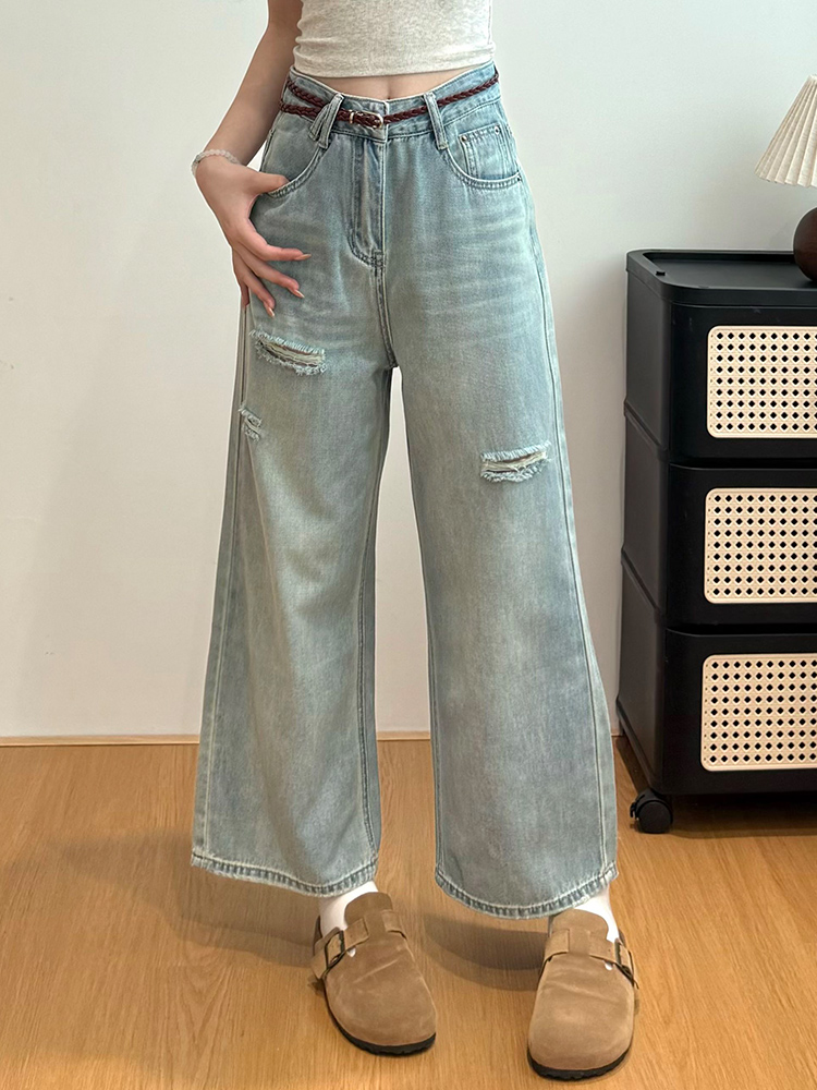 실사 찢어진 부분 7 점 청바지 여성 2025 여름 얇은 스타일 작은 키 루즈핏 넓은 다리 중 바지