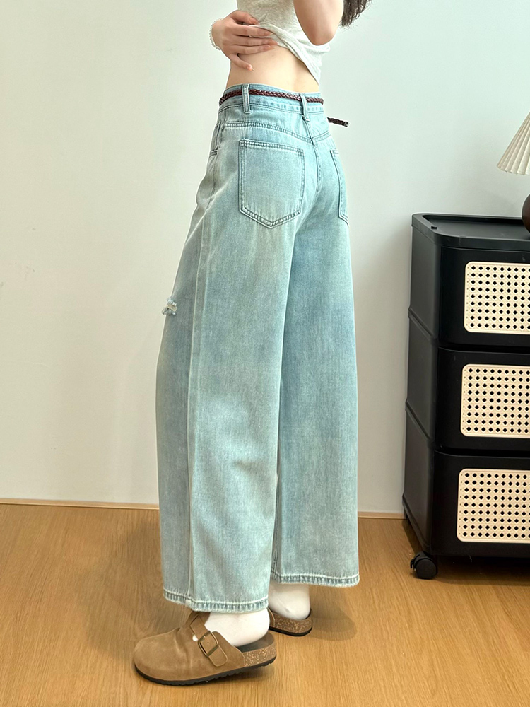실사 구멍 거친 가장자리 넓은 다리 데님 오부 바지 여성 2025 여름 루즈핏 슬림해 보이는 스트레이트 바지