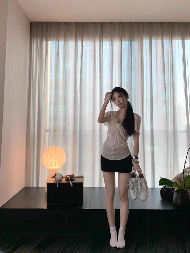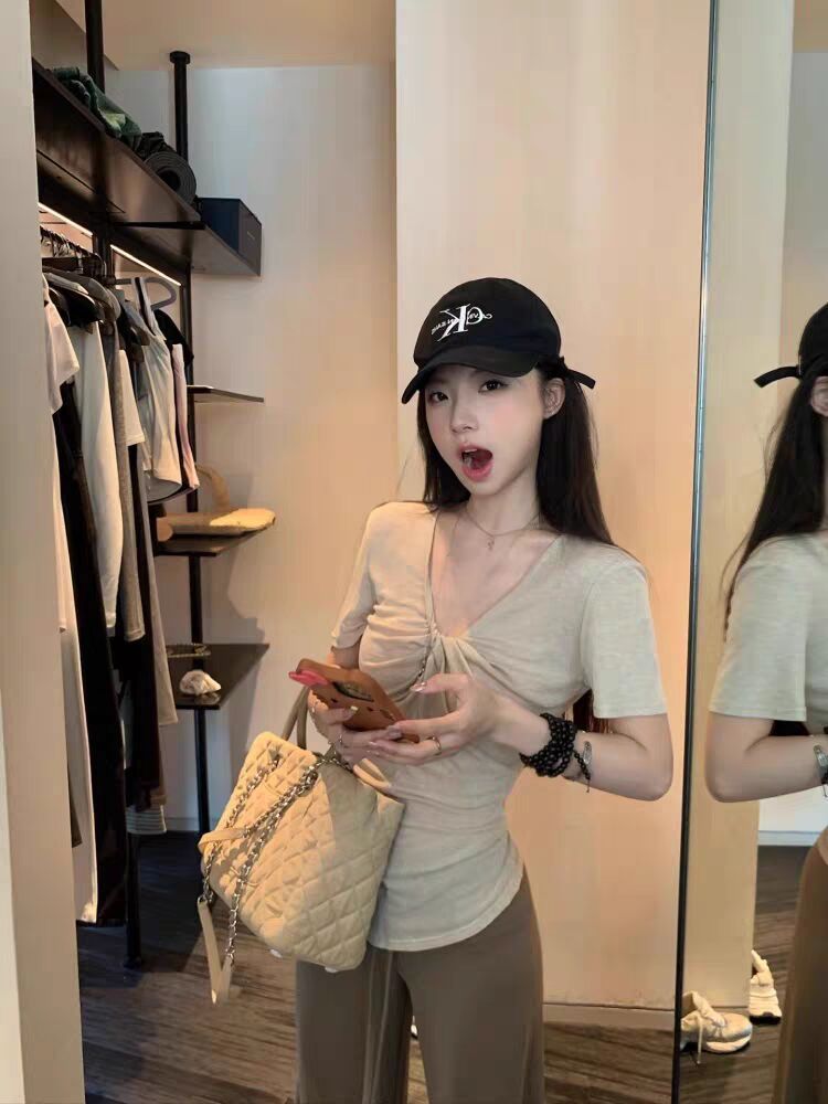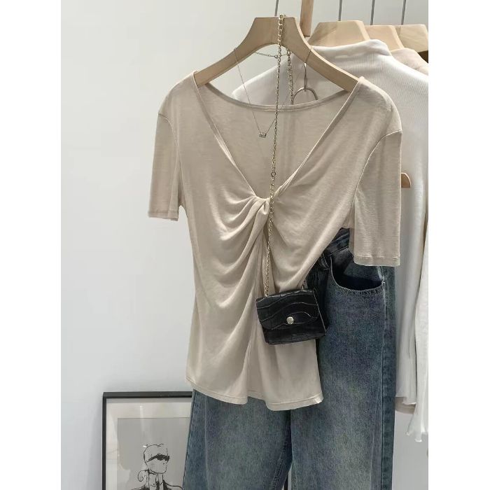 한 부서 비틀림 V넥 반팔 티셔츠 여성 인사이드 가져 가라. 아름다운 품격 몸매 가꾸기 슬림해 보이는 디자인 센스 맨위